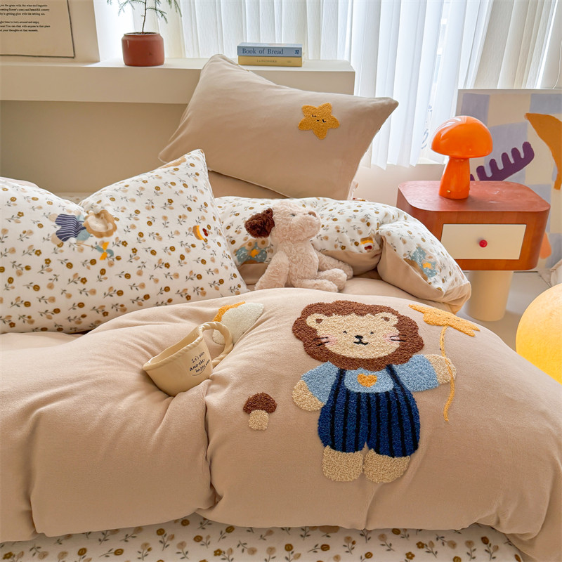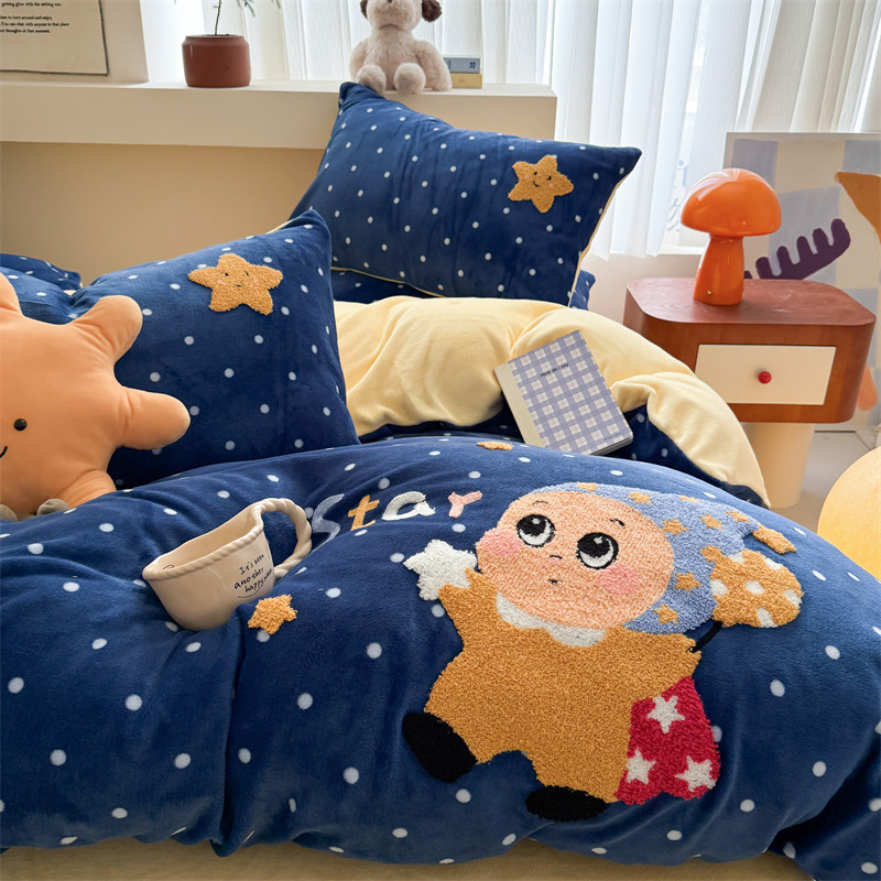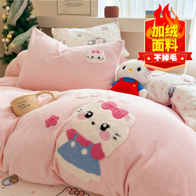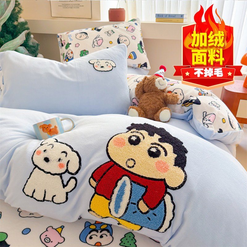 毛巾绣冬季牛奶绒四件套卡通蜡笔小新双面珊瑚绒厚被套宿舍三件套