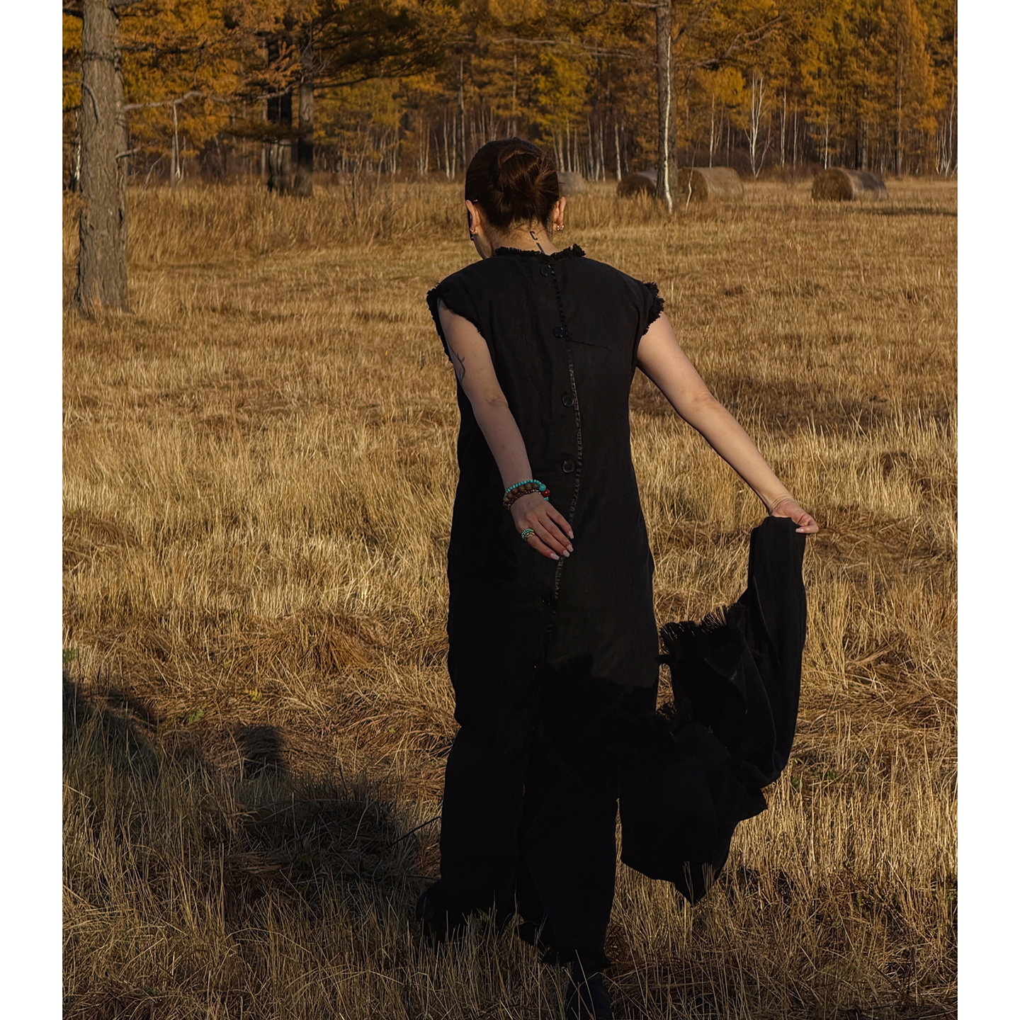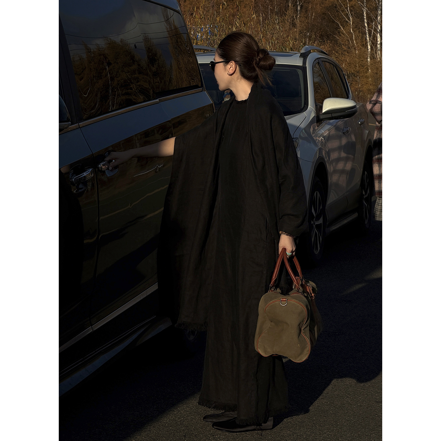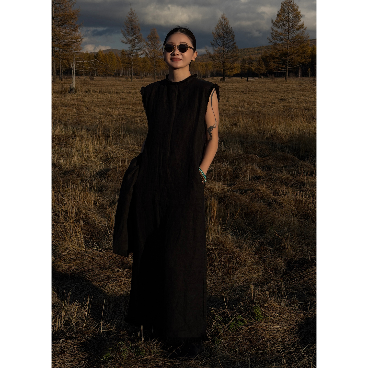 CHU楚妞[光萤]]亚麻长款背心连衣裙2025秋季新款女高级感小黑裙子