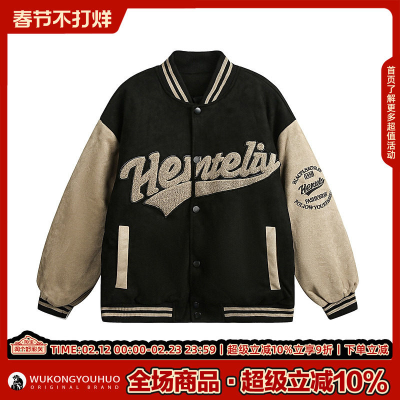 悟空有货美式复古麂皮绒拼接夹棉棒球服男女冬季情侣加厚保暖外套