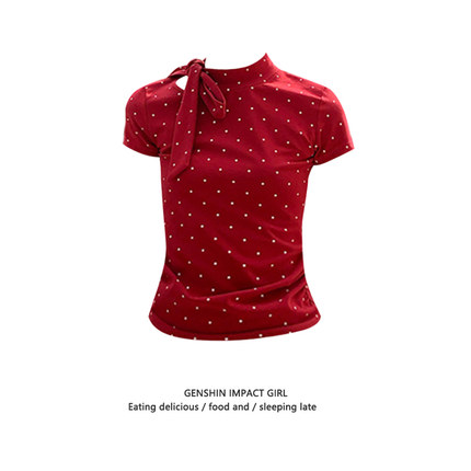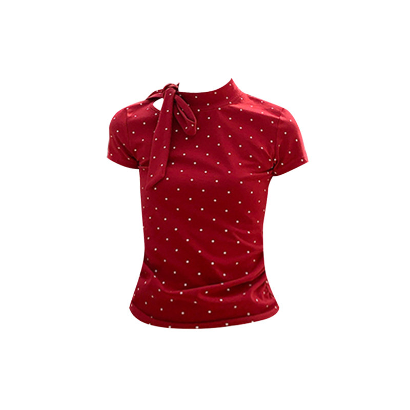 韩版辣妹波点蝴蝶结绑带短袖T恤女夏季新款修身显瘦立领百搭上衣