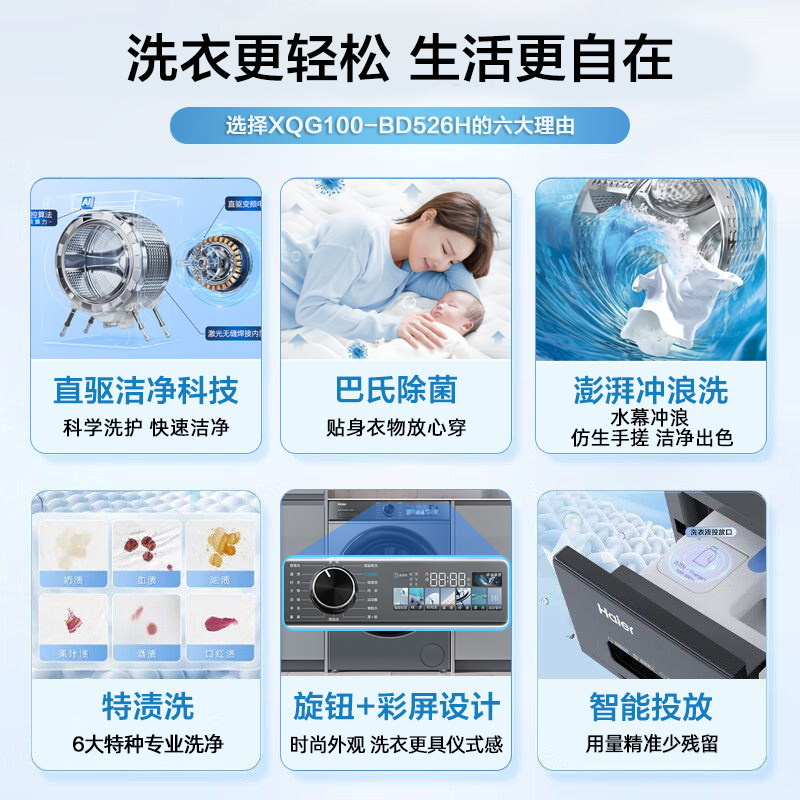 新款海尔全自动10公斤直驱变频滚筒洗衣机一级能效烘一体526H
