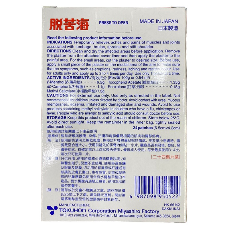 【香港直邮】日本大正脱苦海外用镇痛貼24片舒缓腰肩颈痛扭伤酸痛