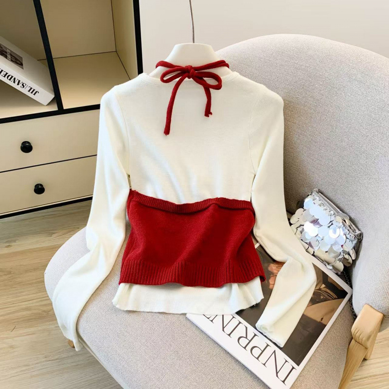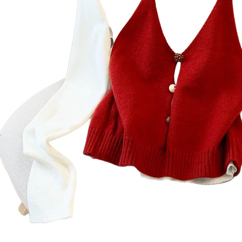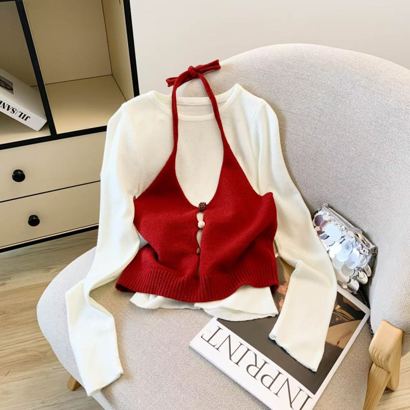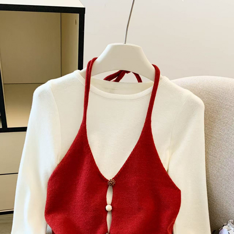 韩系洋气纽扣针织吊带背心+蕾丝拼接上衣叠穿两件套女装