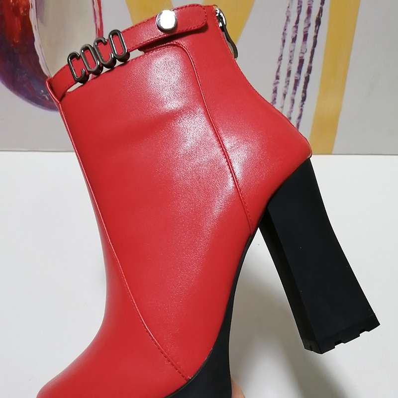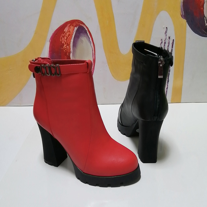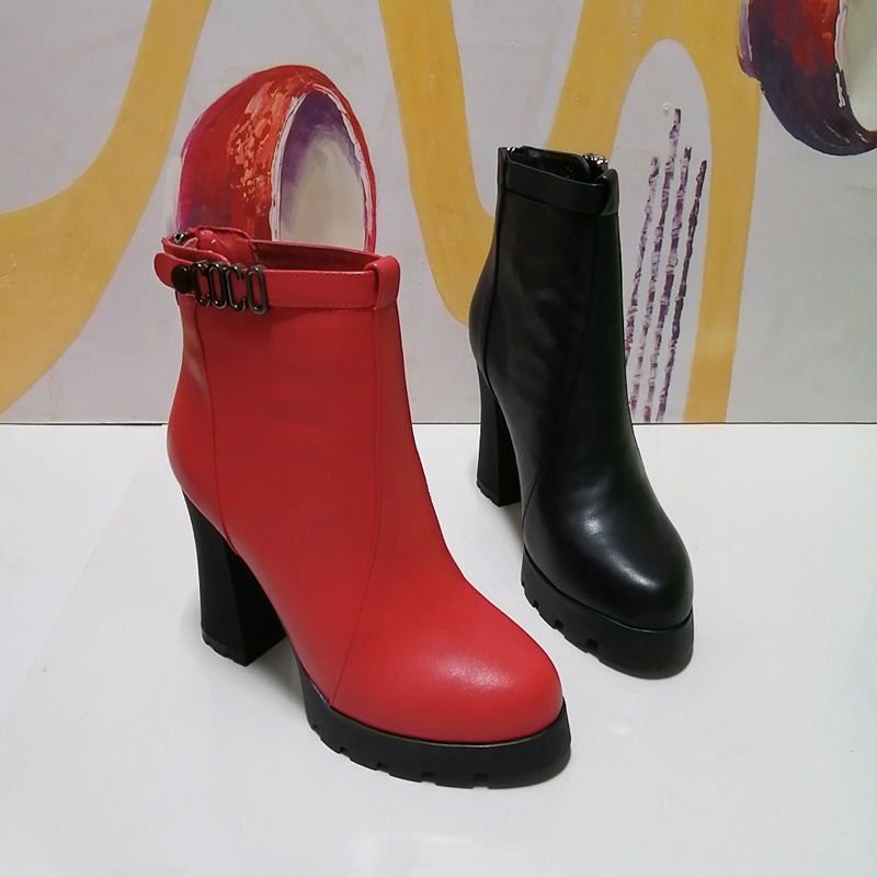 葆尔力胎牛皮粗跟高跟防水台后拉链加绒韩版女短靴增高鞋反季清仓