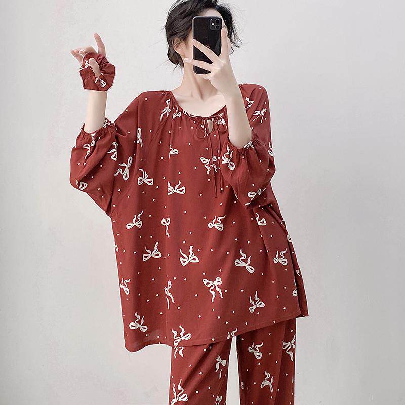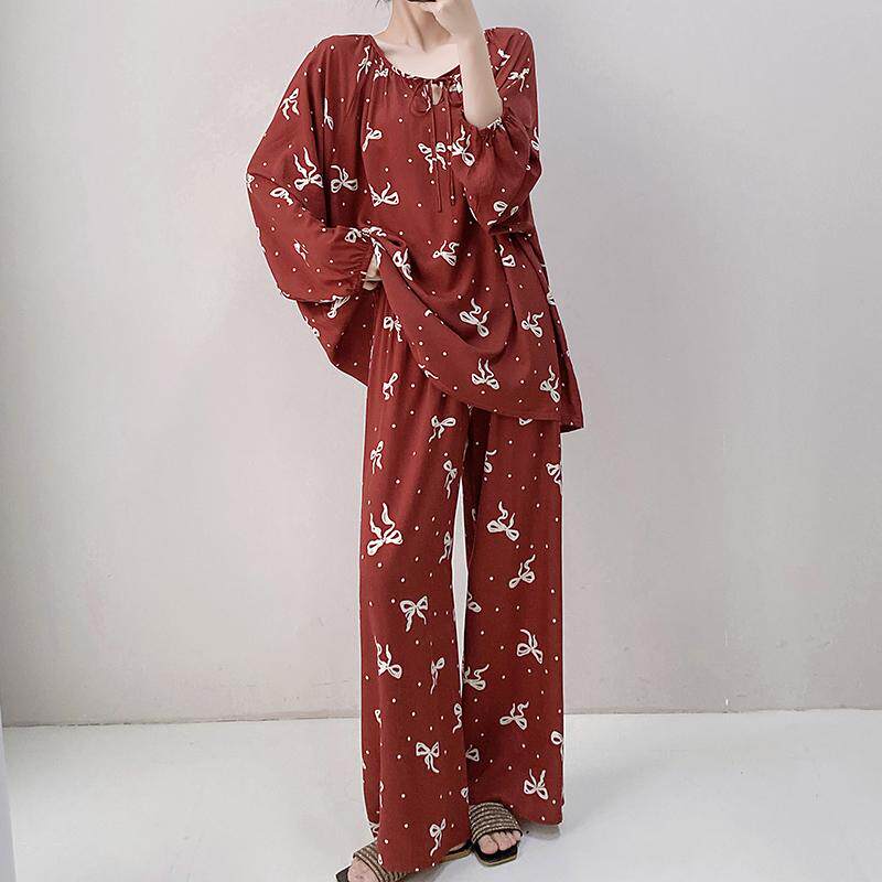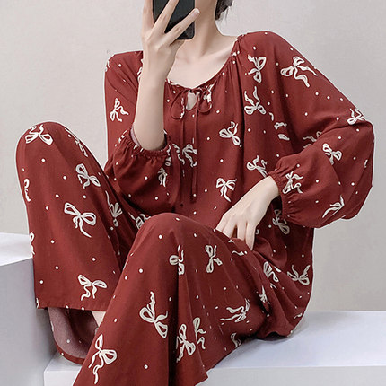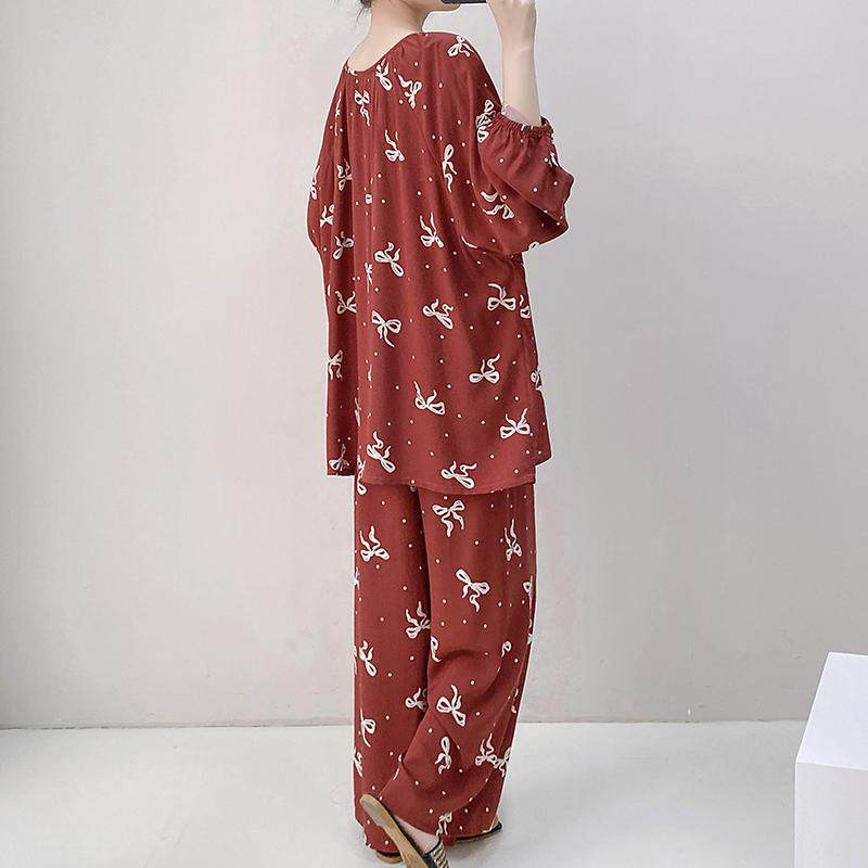 新年战袍棉绸睡衣女春夏红色蝴蝶结印花新中式国风家居服绵绸套装