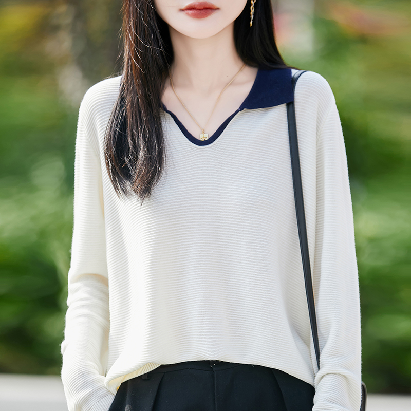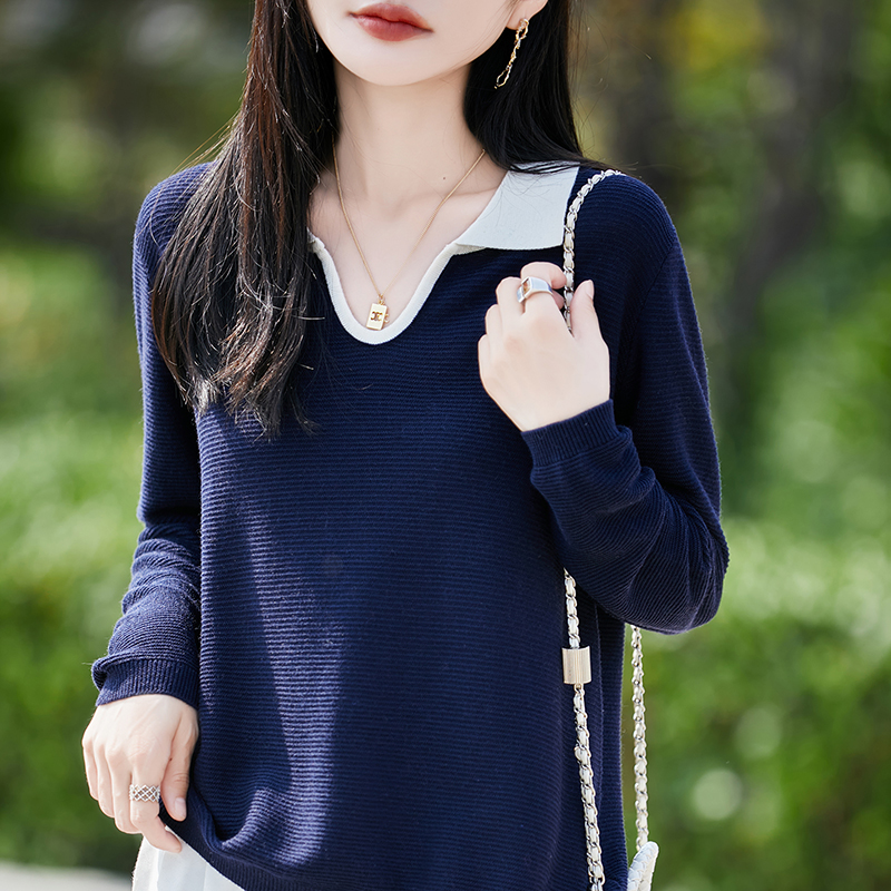 羊毛衫秋冬新款拼色翻领短袖女士针织衫套头毛衣宽松洋气减龄上衣