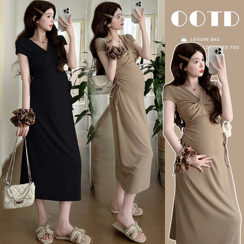 孕妇装夏装设计感收腰短袖连衣裙2025新款孕妇裙夏季长裙怀孕裙子