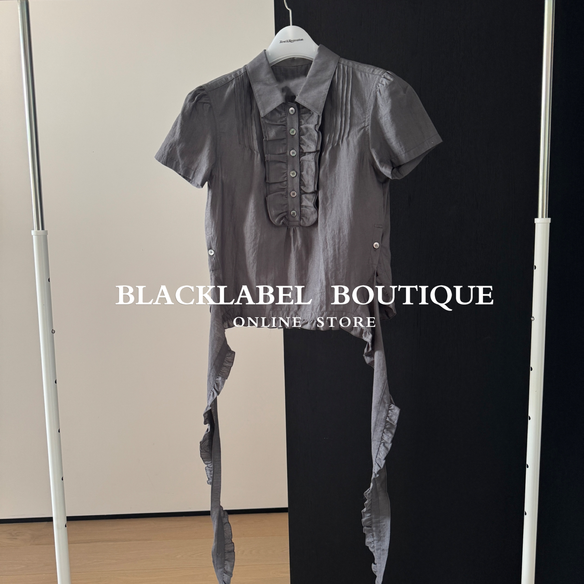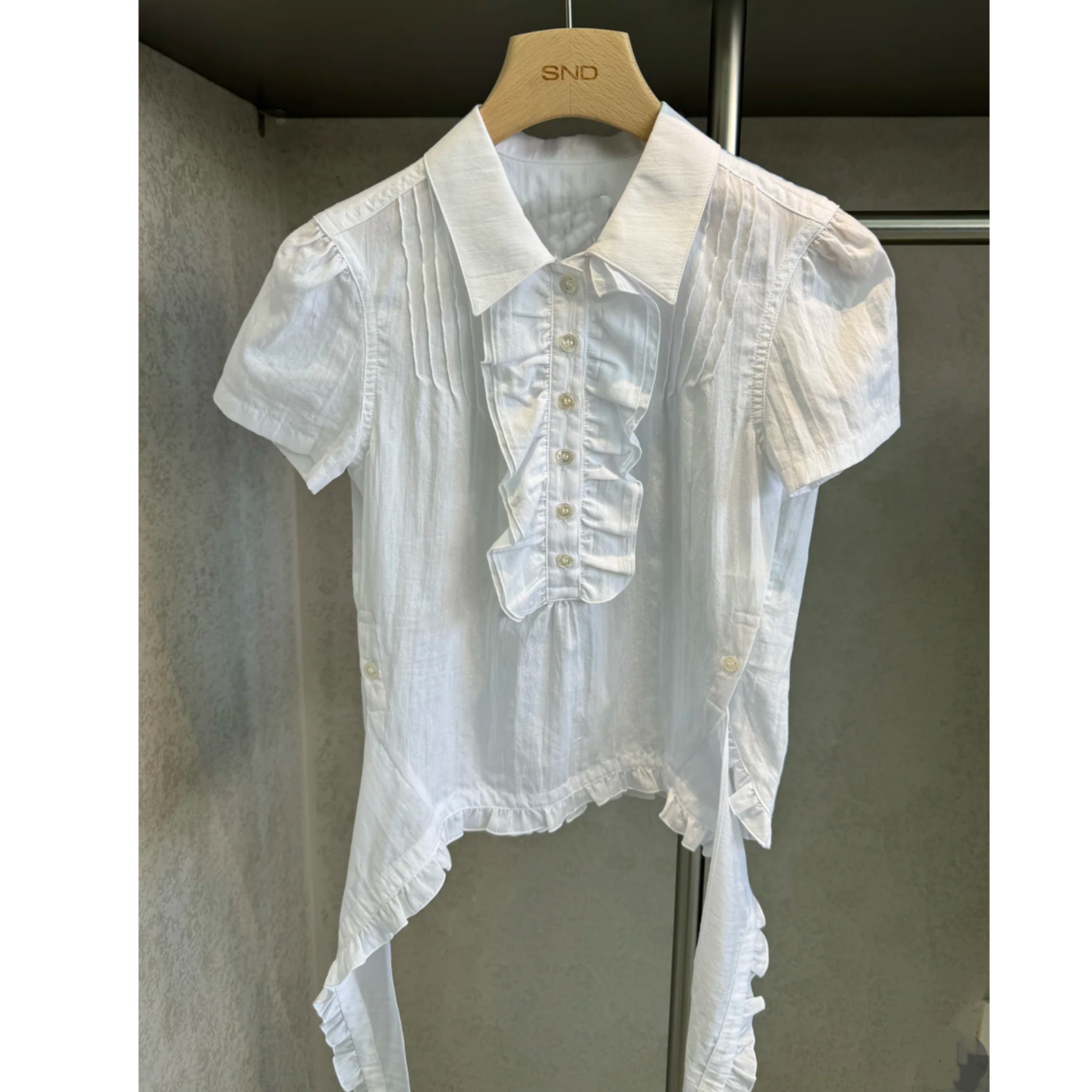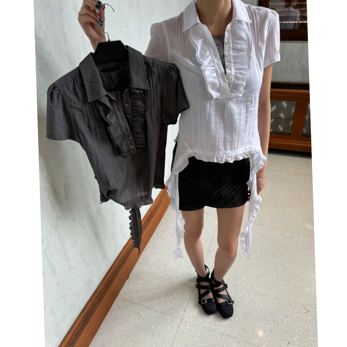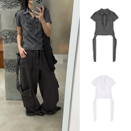 TINA OPEN YY 25夏季新款 褶皱木耳边翻领设计飘带短袖T恤女