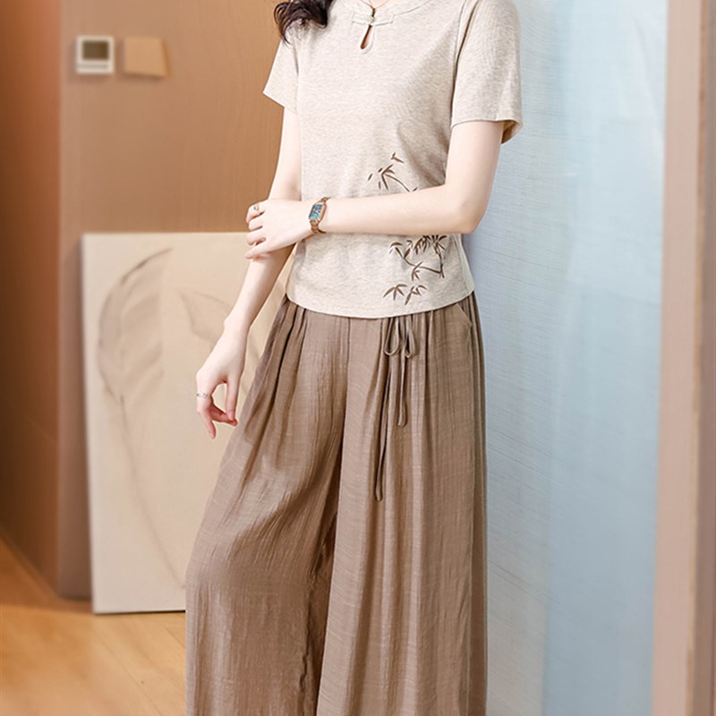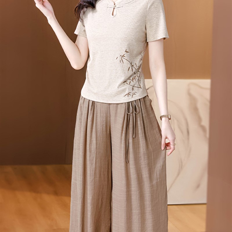 极速妈妈夏装气质阔腿裤套装女士2024新款时尚洋气V国风新中式两