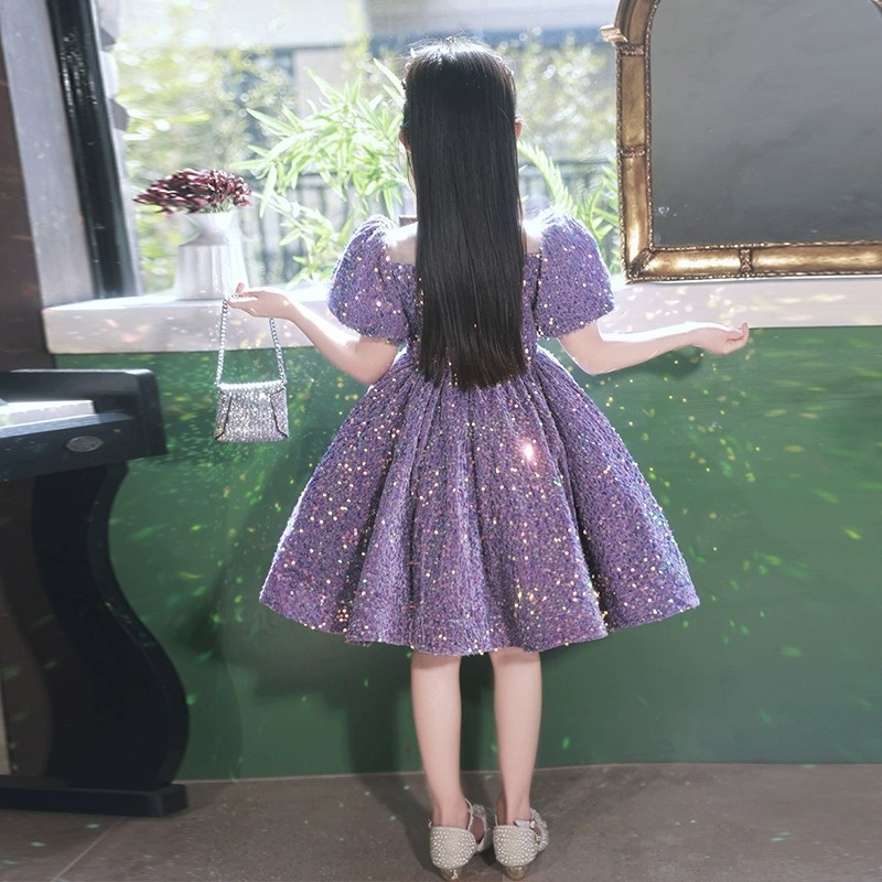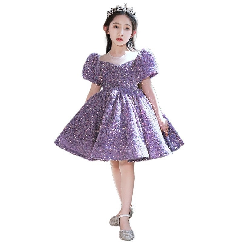 2025新款儿童礼服公主裙紫色泡泡袖亮闪闪女孩钢琴演出服厂家