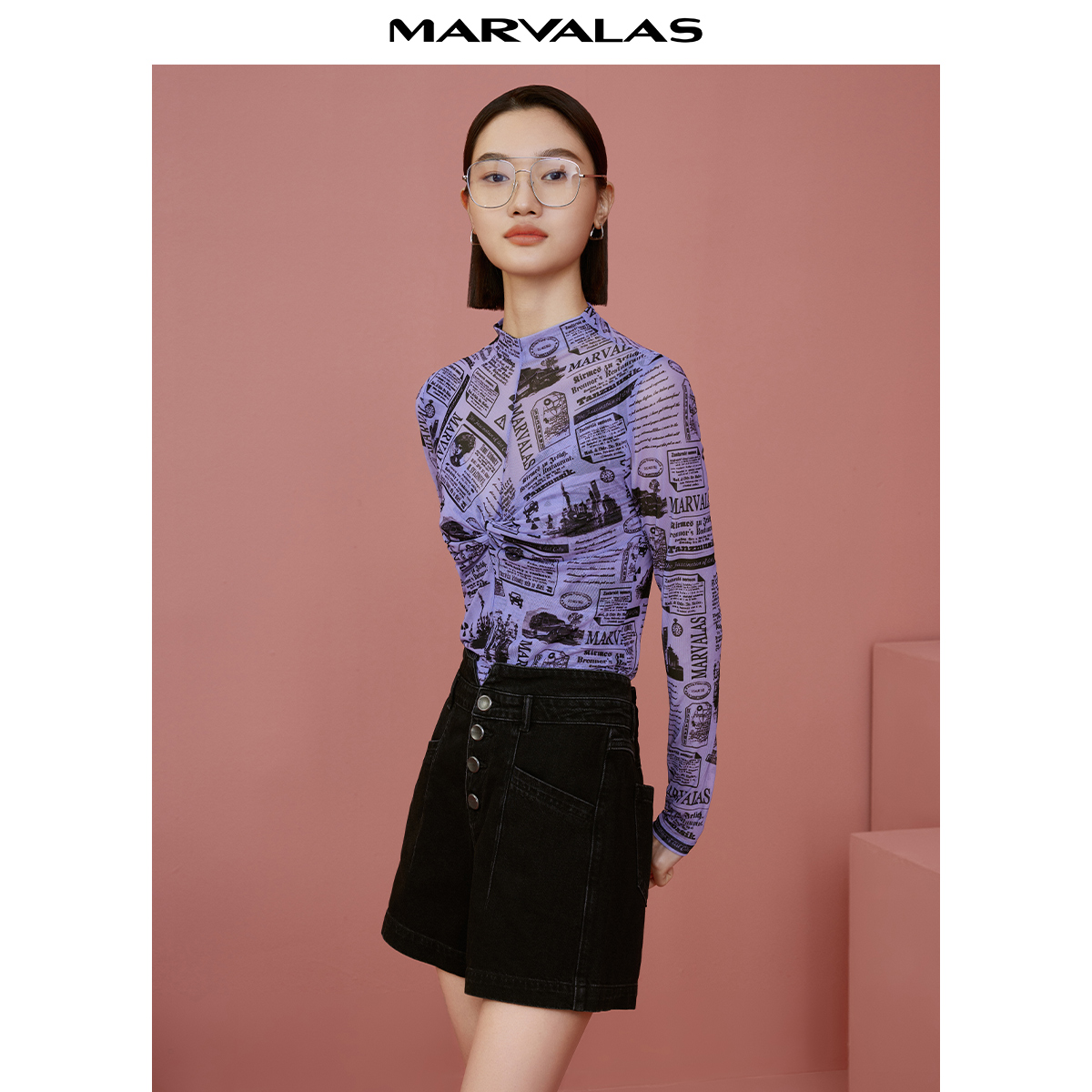 曼德诗设计感网纱雪纺衫2025秋季新款半高领复古印花假两件上衣