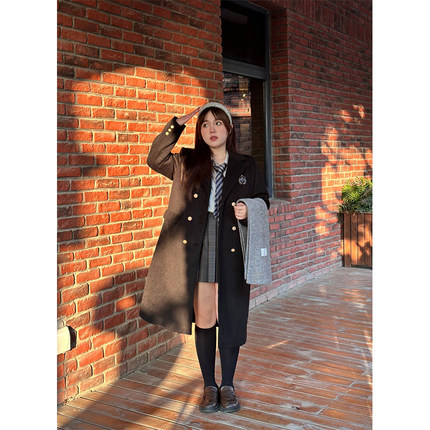 阿车家的大码jk原创中长款学院风双排扣大衣女秋冬胖mm毛呢外套