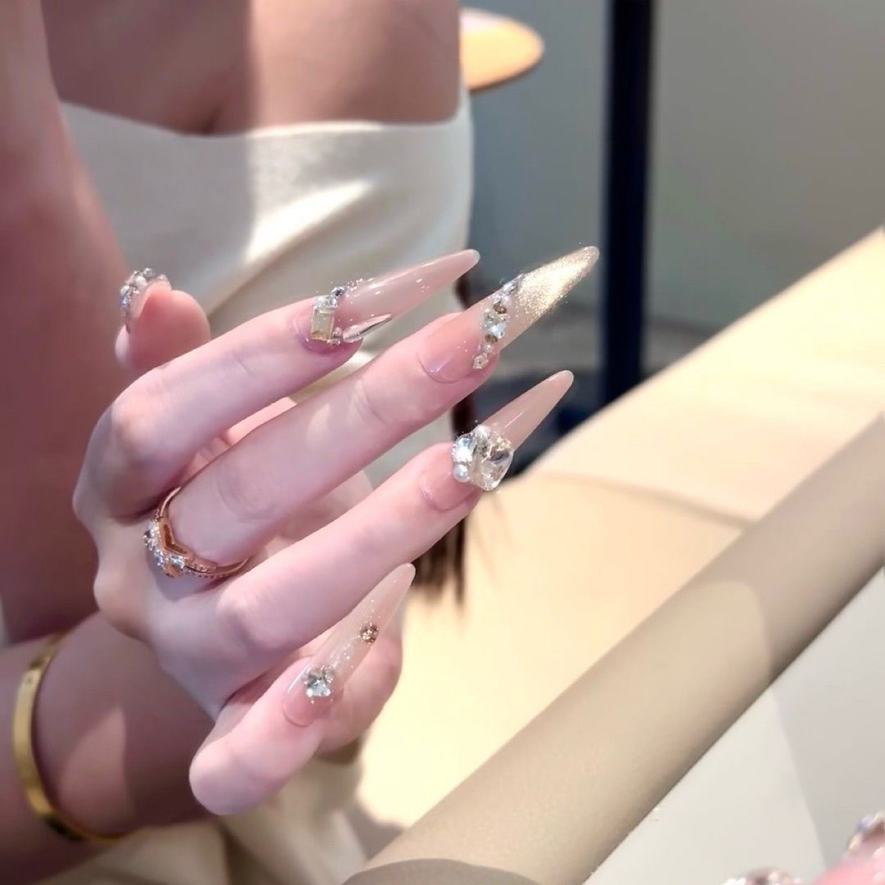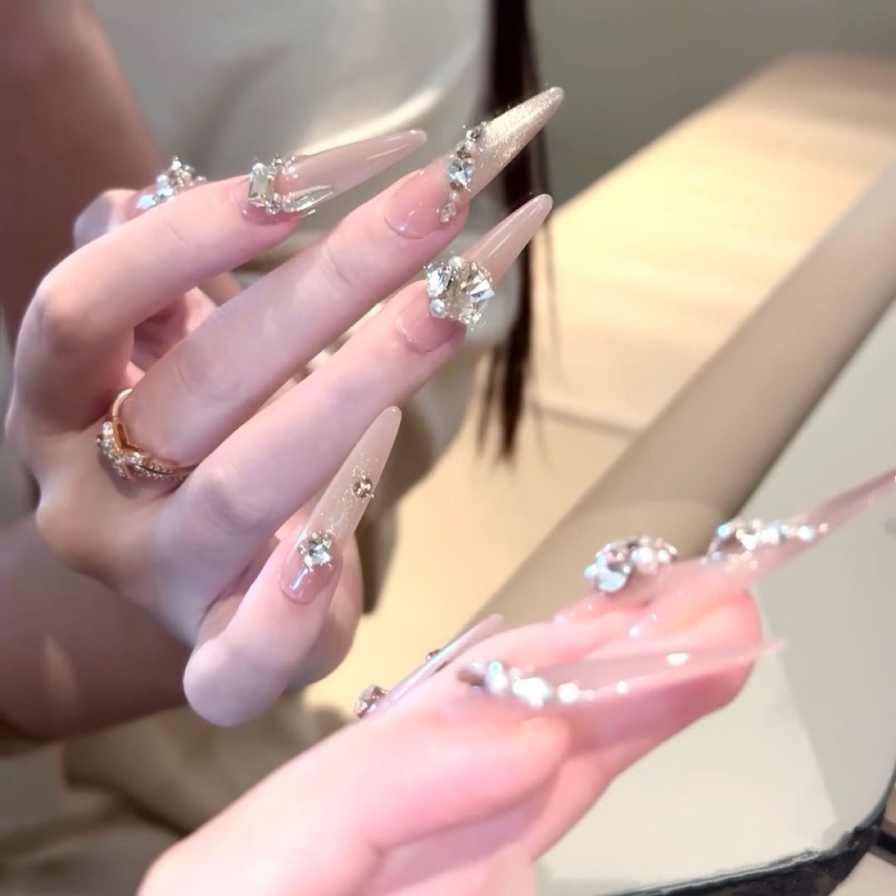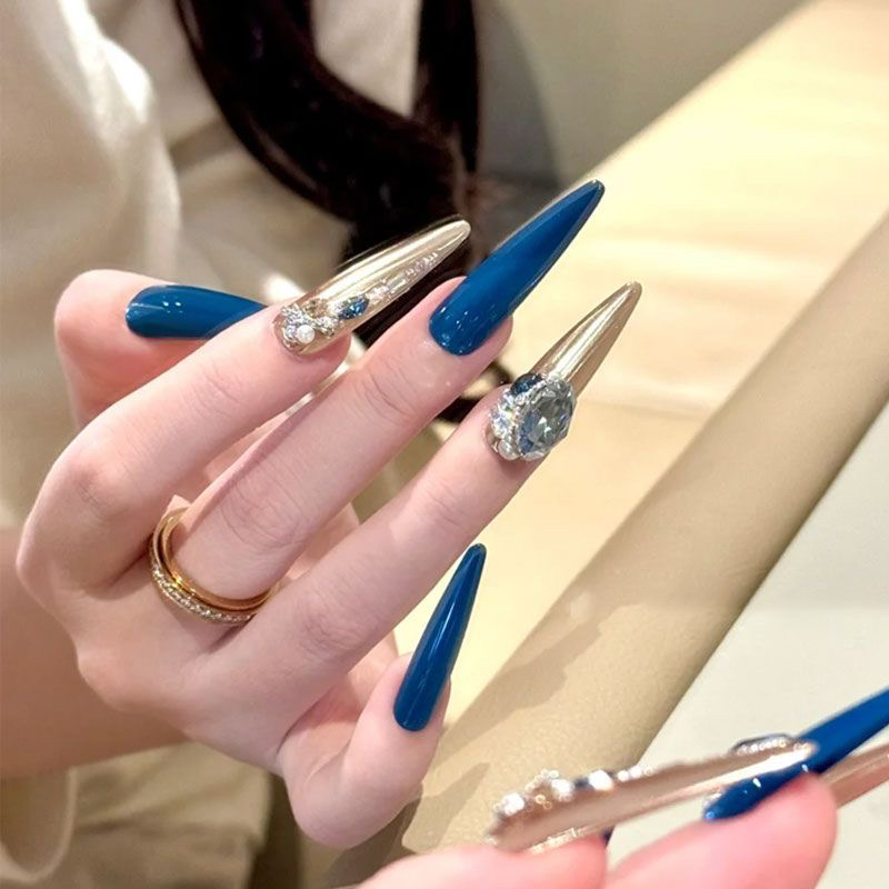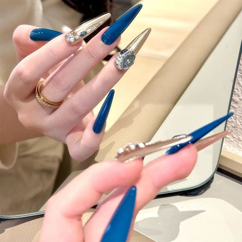 纯手工美甲超长穿戴甲蓝调魔镜粉满钻爆闪显白指甲贴可拆反复使用