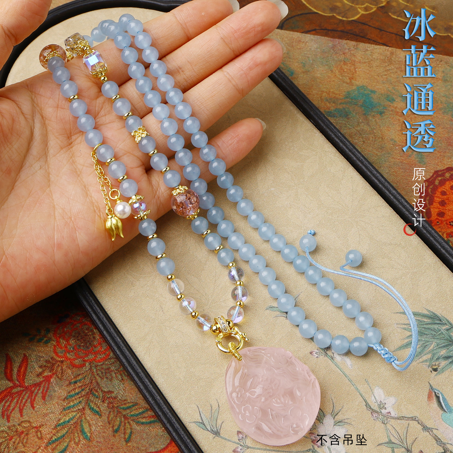 蓝玉髓6mm圆珠佛牌链60cm可调节通用链新中式毛衣链国风流苏