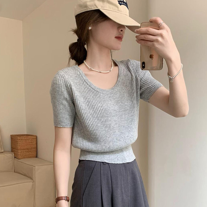 韩版休闲U领短款冰丝针织衫夏新款百搭纯色减龄短袖上衣气质T恤女