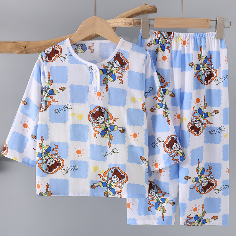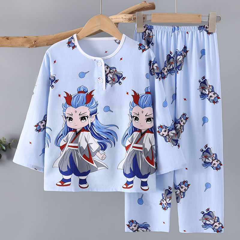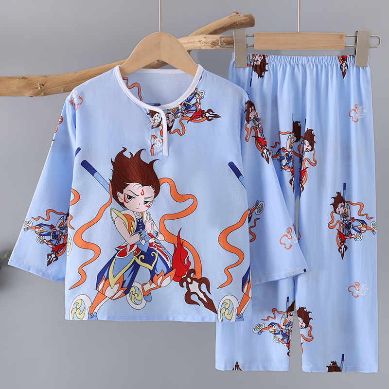 儿童夏季睡衣哪吒长袖绵绸中大童睡衣家居服男女童敖润空调服套装