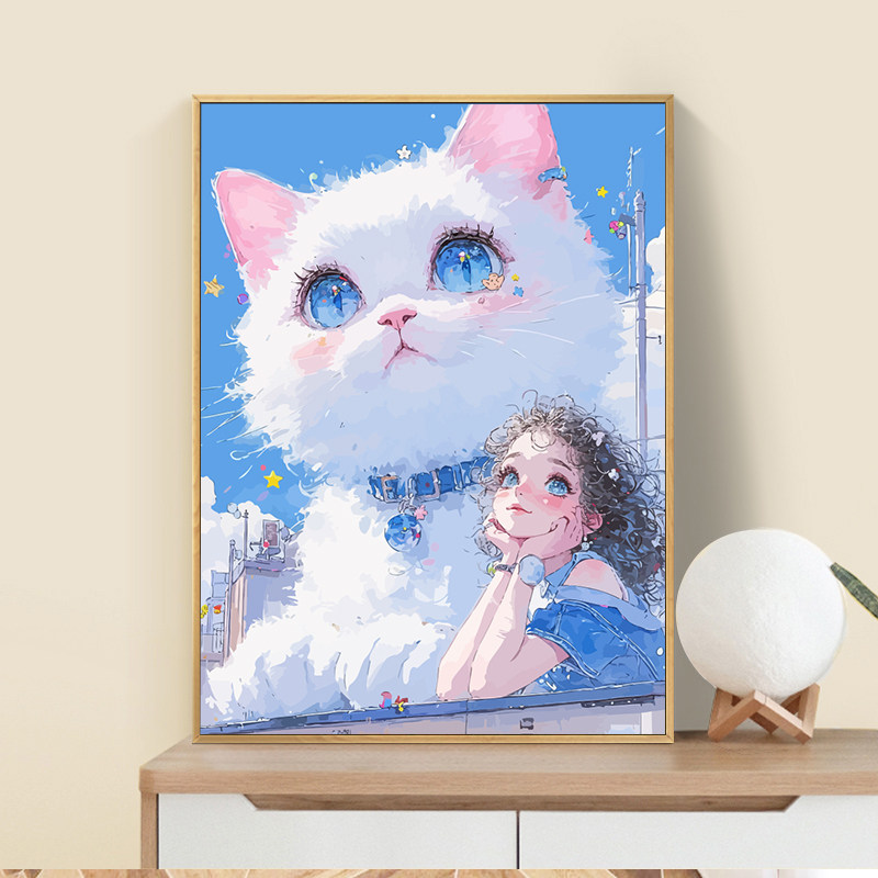 丙烯治愈女孩和猫数字油画宫崎骏