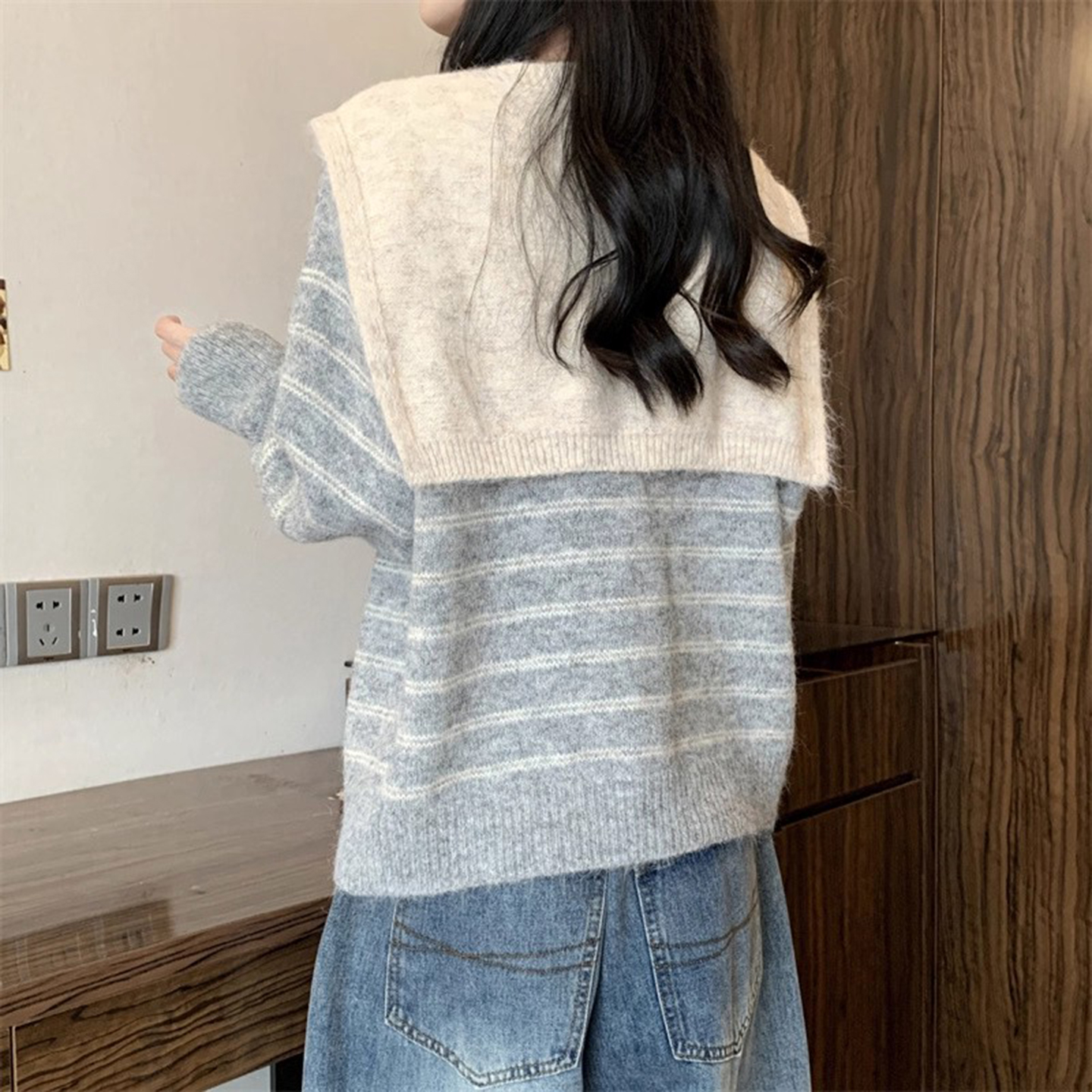 韩系条纹圆领披肩针织开衫外套女秋冬新款宽松慵懒风时尚毛衣上衣