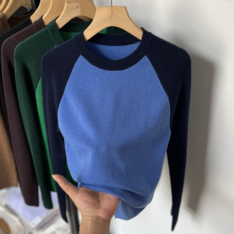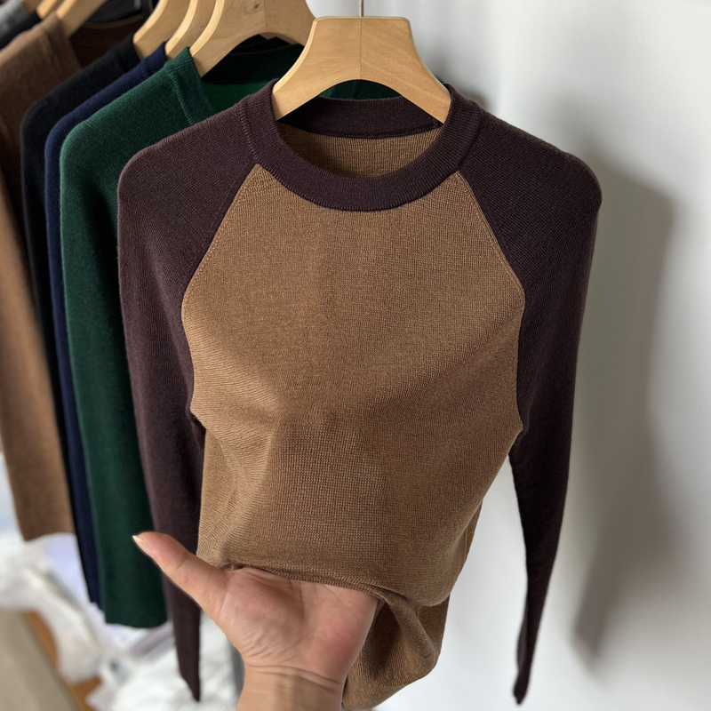 美丽诺纯羊毛撞色半高圆领针织打底衫女秋冬修身薄款长袖内搭毛衣