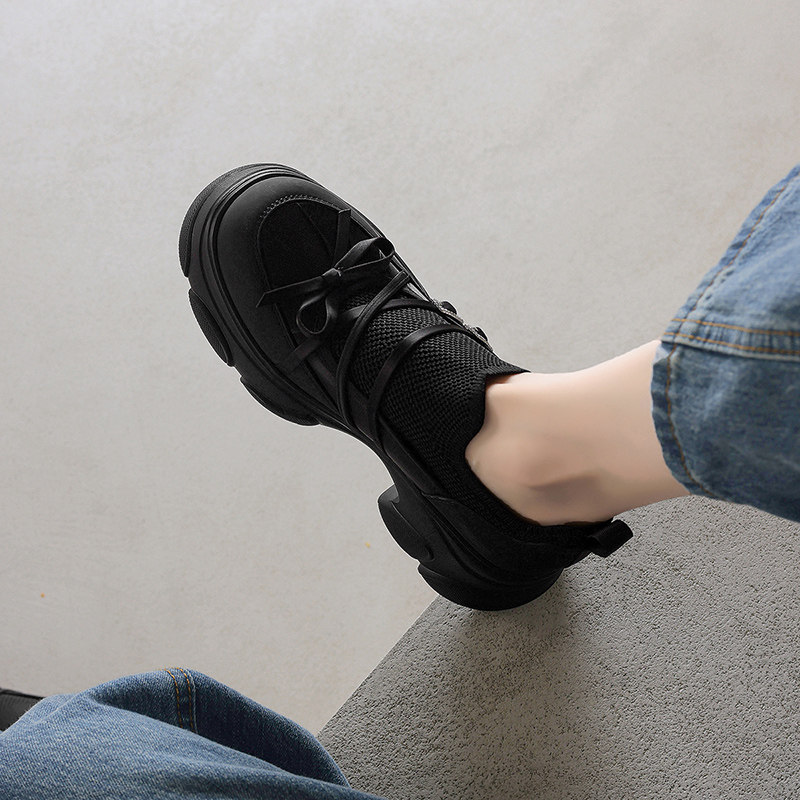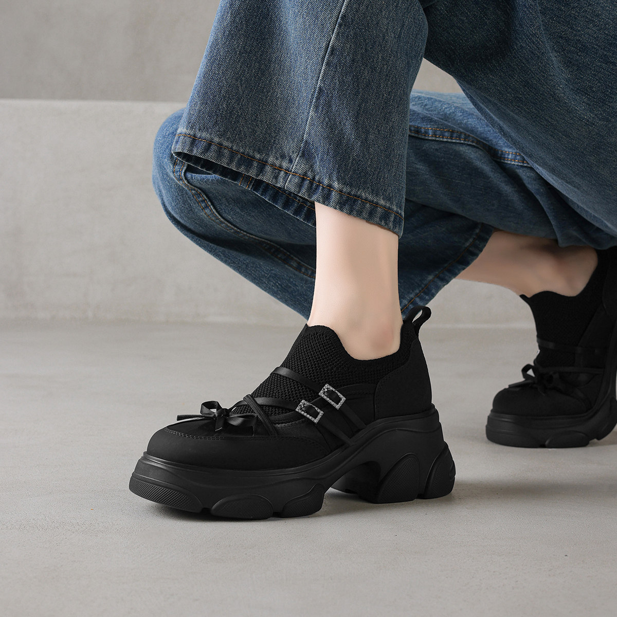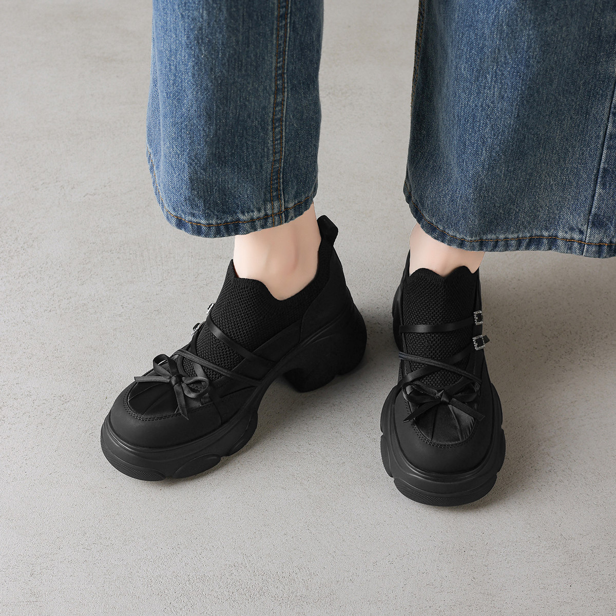 阿么手工女鞋高跟双排扣小蝴蝶结松糕鞋7CM松紧百搭休闲鞋一脚蹬
