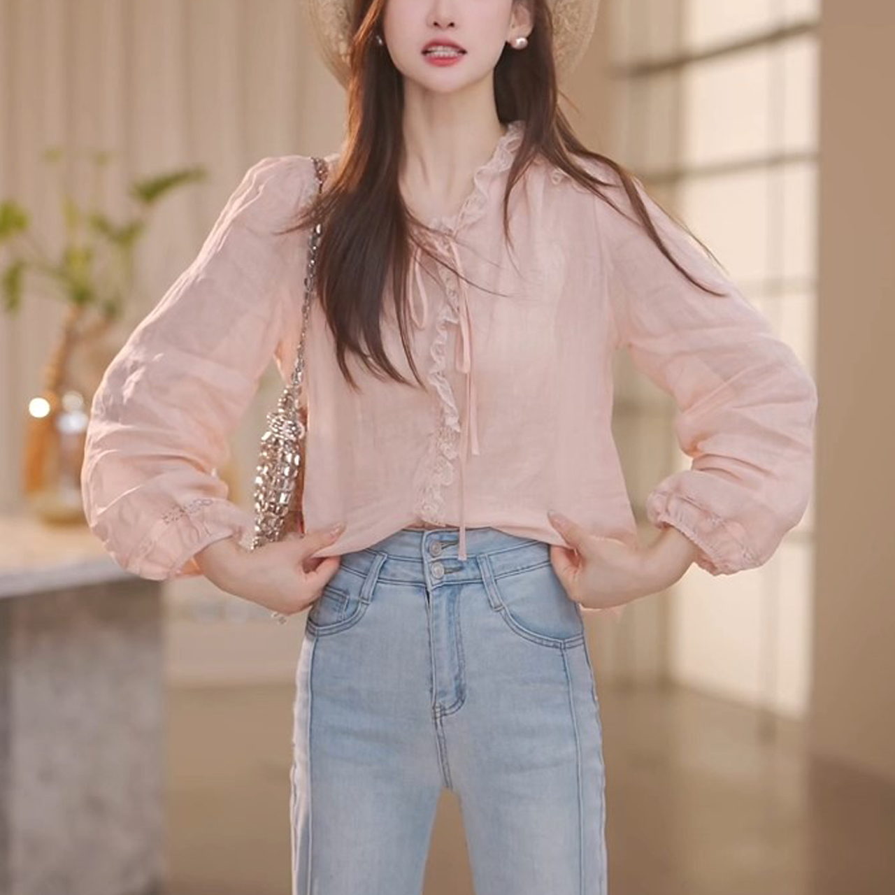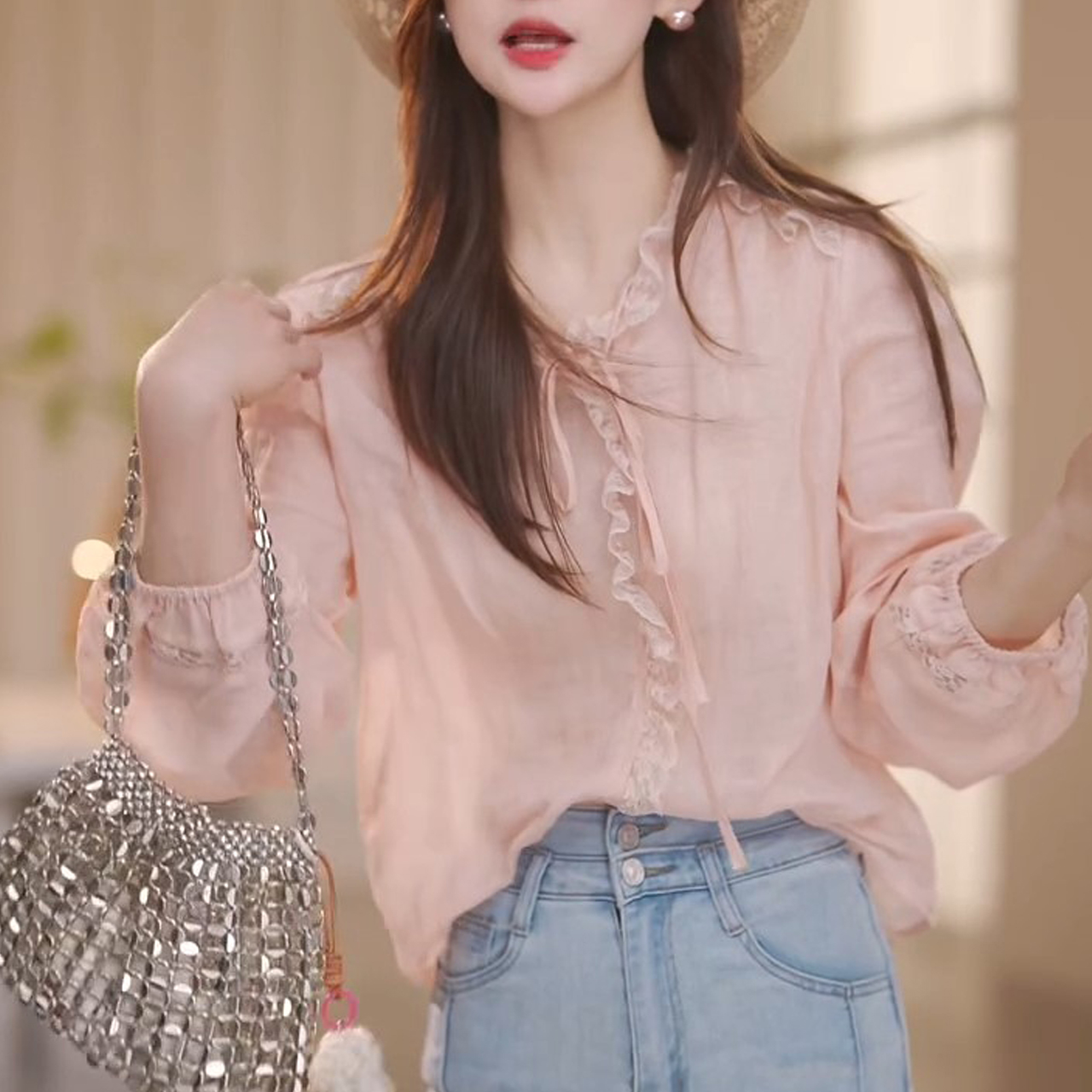 时尚小个子气质百搭显瘦上衣2025秋季新款拼接蕾丝木耳边长袖衬衫