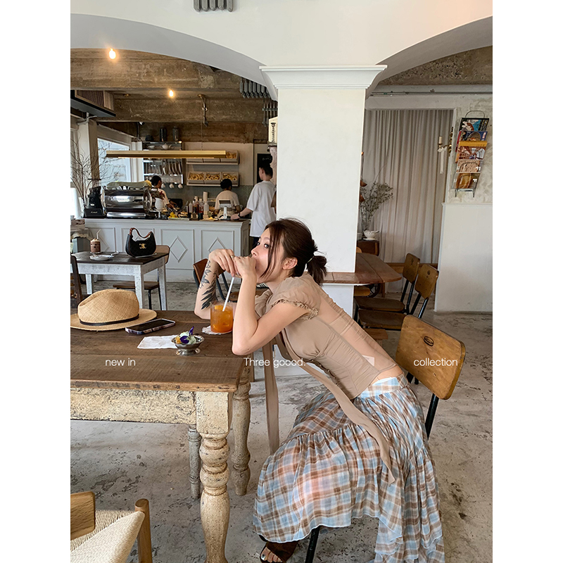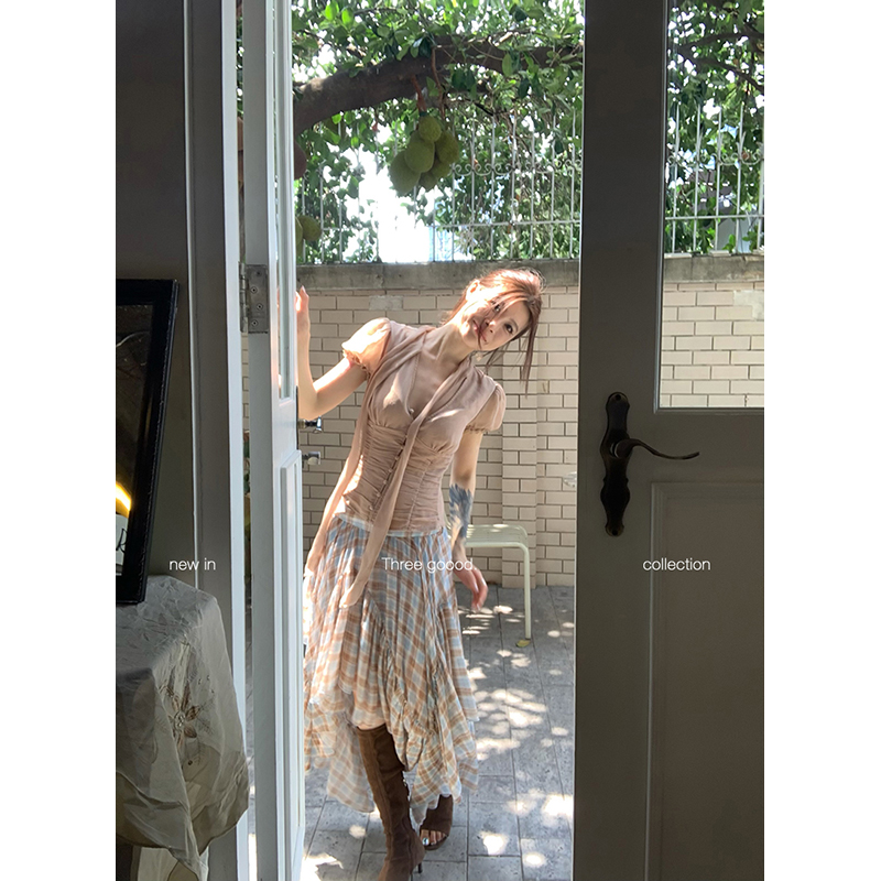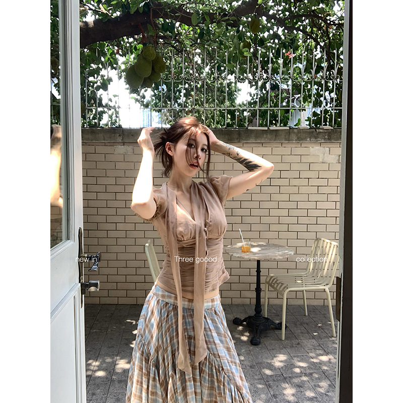 THREE GOOOD殷三吉V领泡泡袖飘带雪纺小衫排扣收腰显瘦上衣女