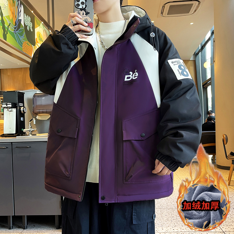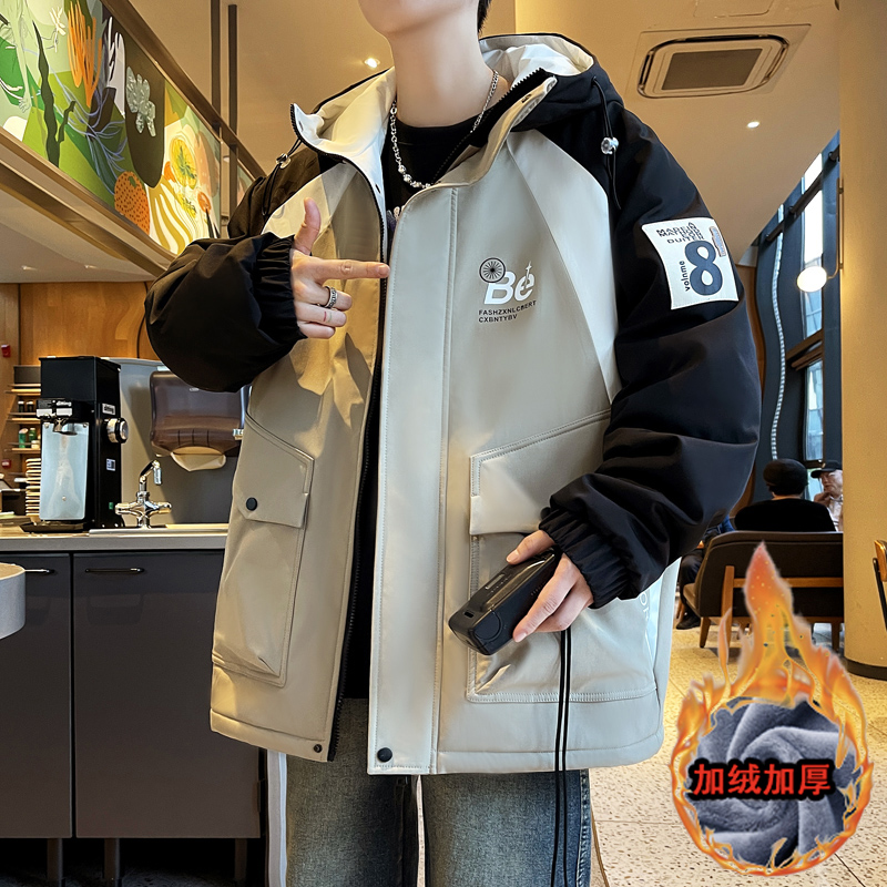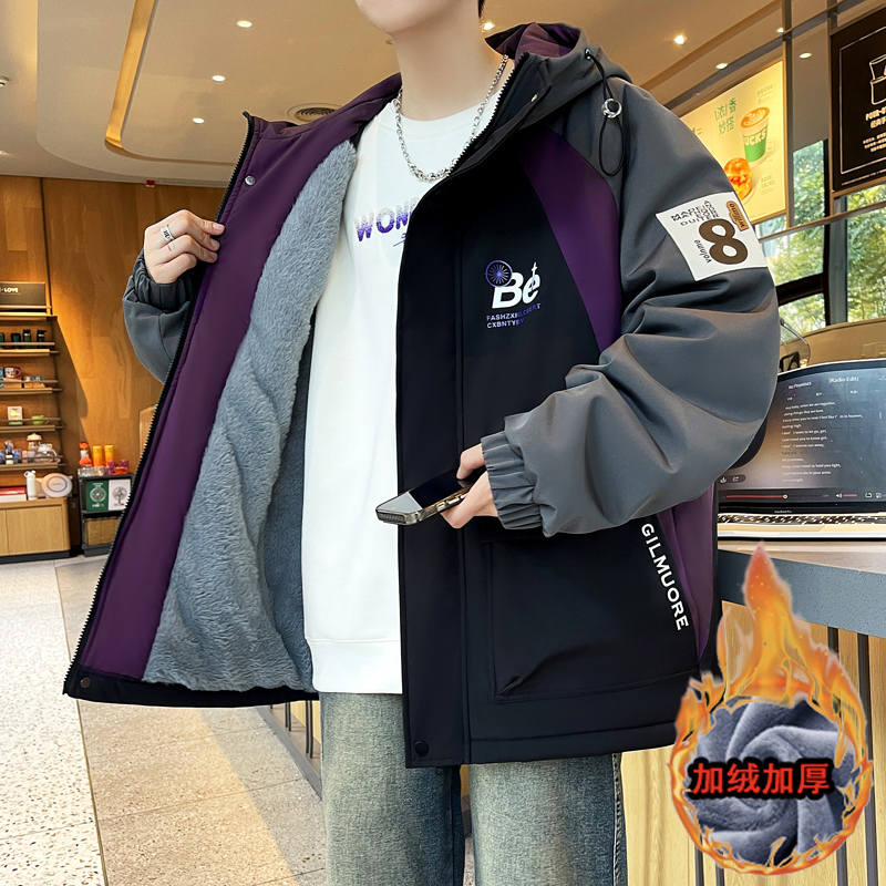 秋冬新款青少年高品质加绒加厚连帽夹克拼色设计港风个性男生外套