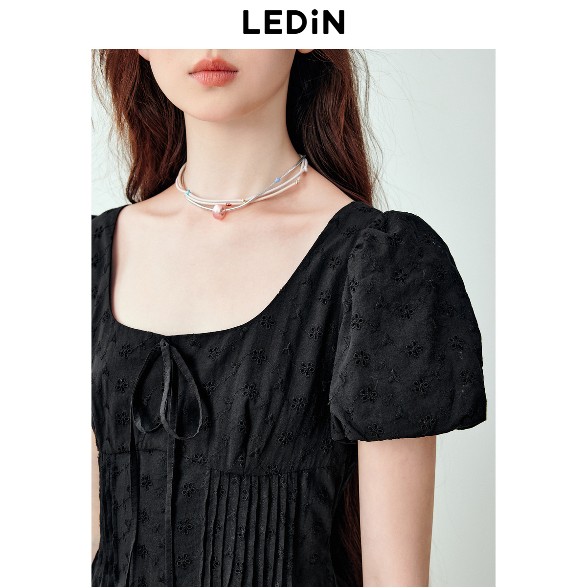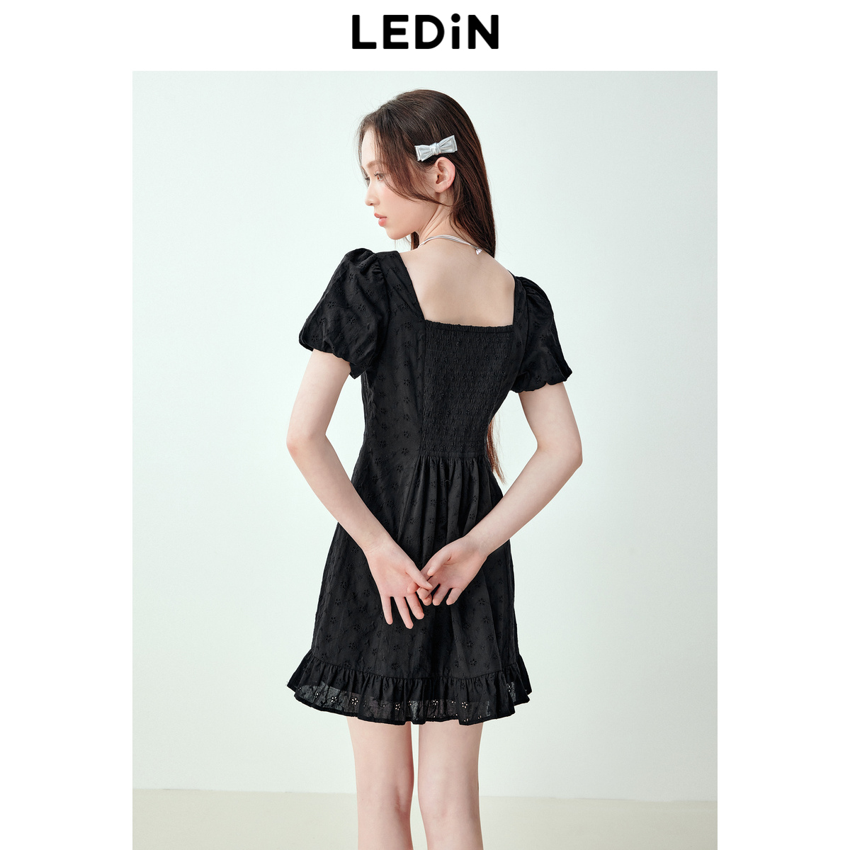 乐町收腰小黑裙夏季新款立体塔克线遮肉显瘦小泡泡袖连衣裙