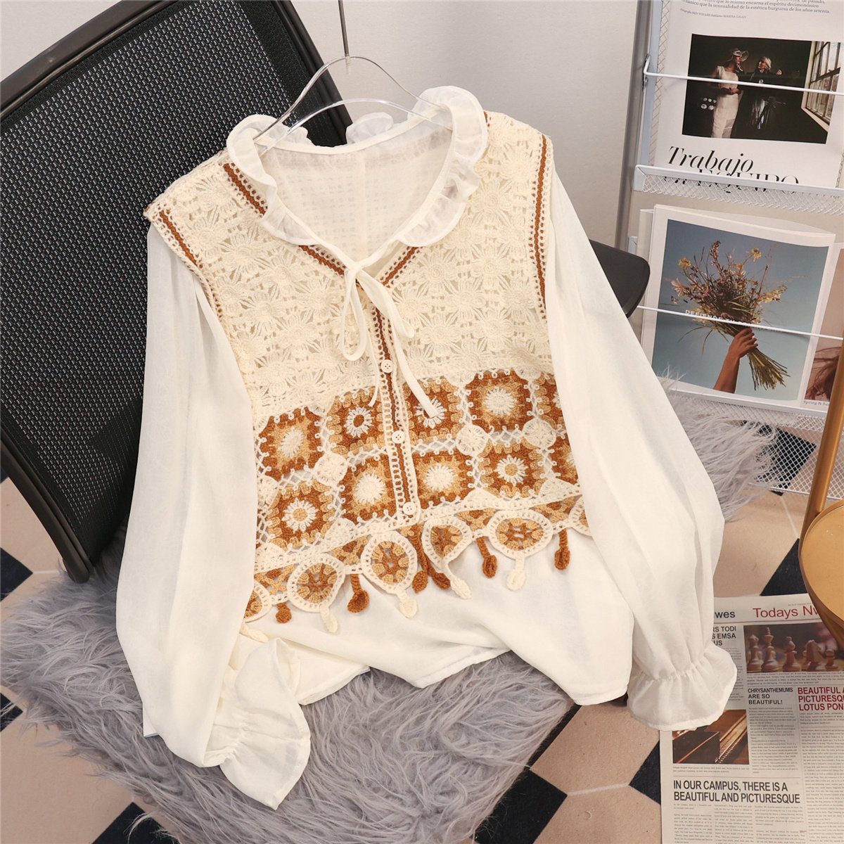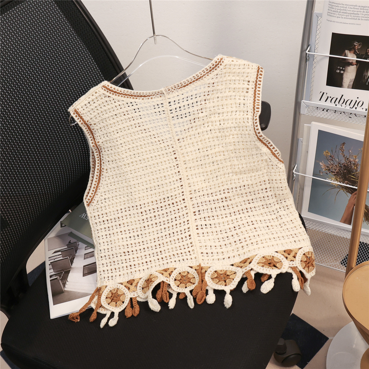 薄款流苏钩花镂空马甲雪纺两件套