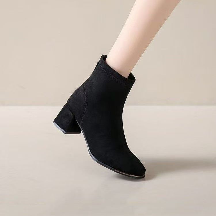 品牌自营真皮法式短靴女2025年新款秋冬粗跟方头瘦瘦靴绒面马丁靴
