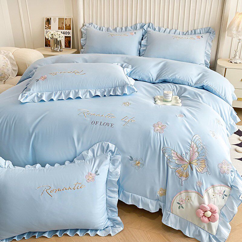 韩版公主风纯棉全棉床上四件w套裸睡刺绣被套少女心高级感床单被