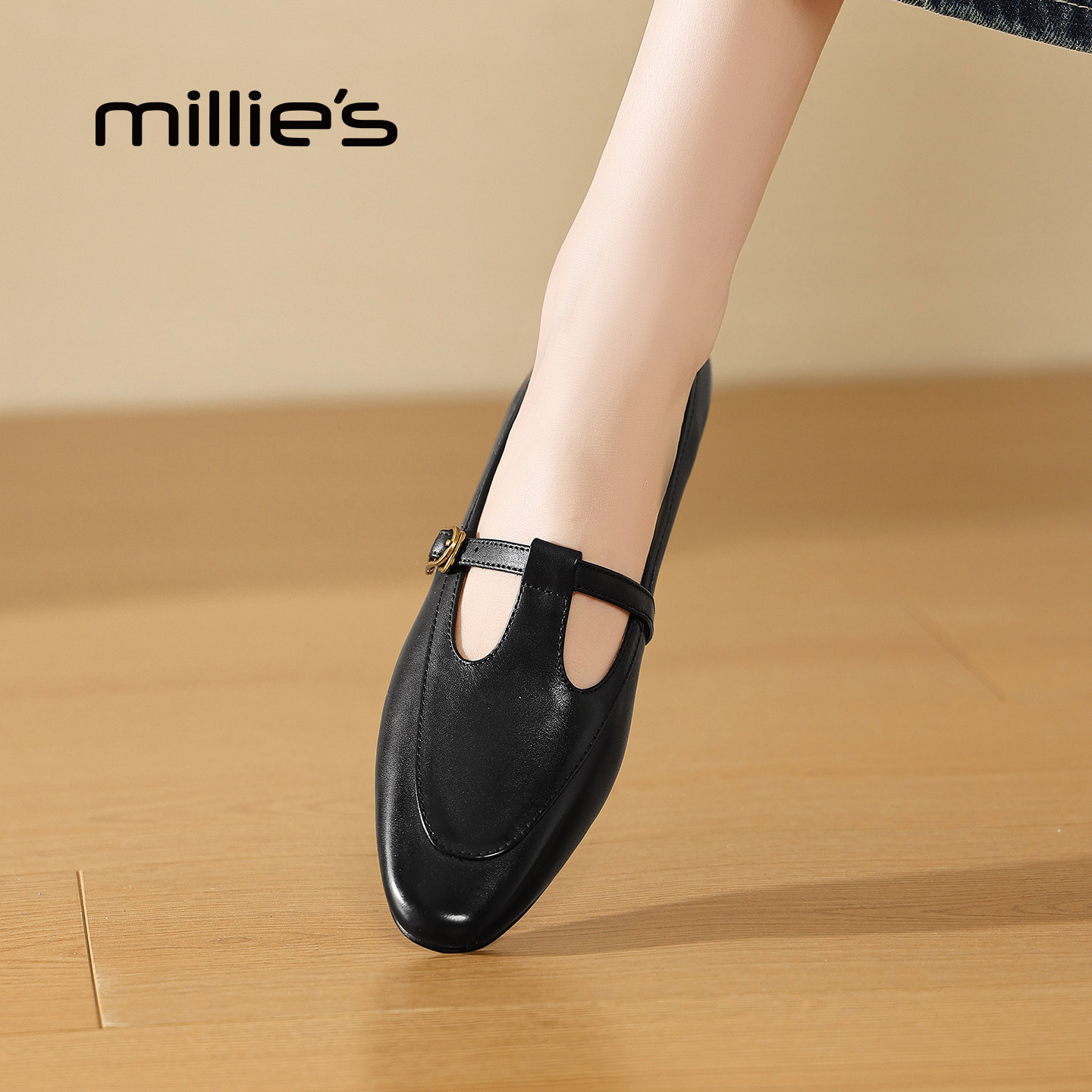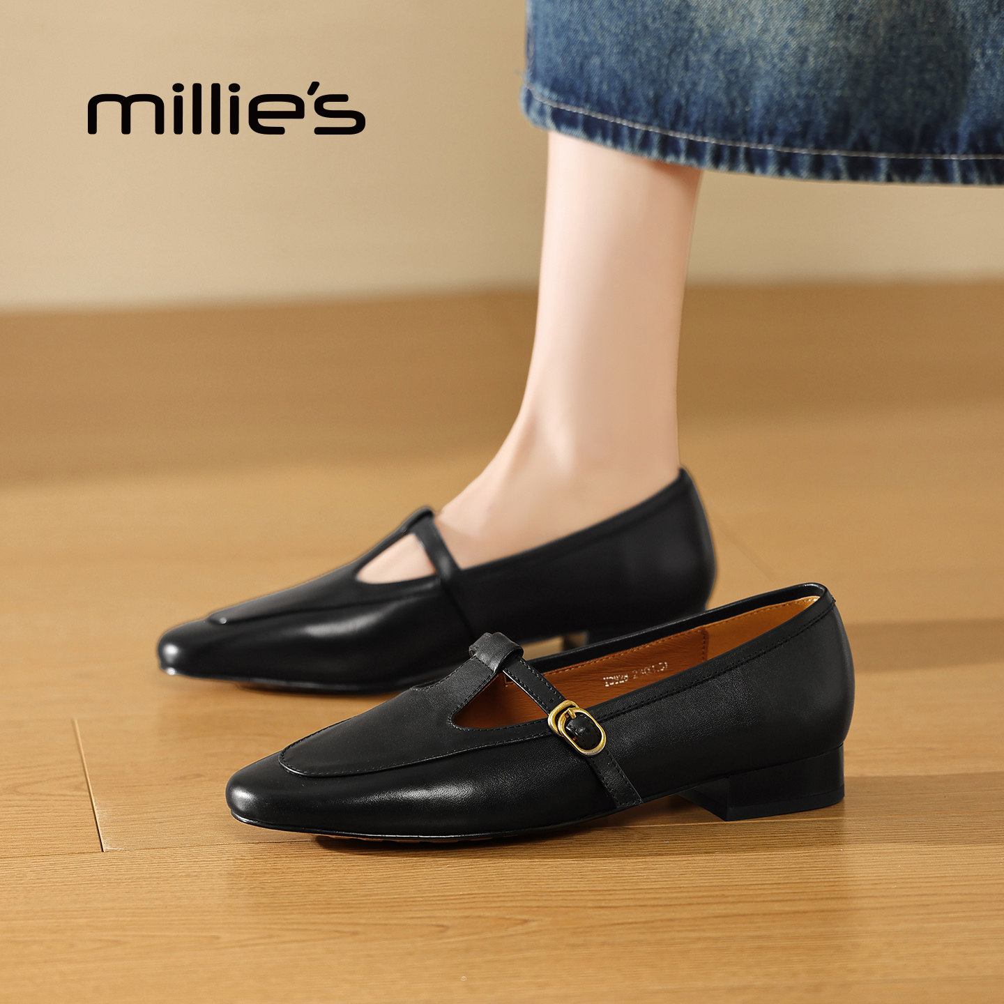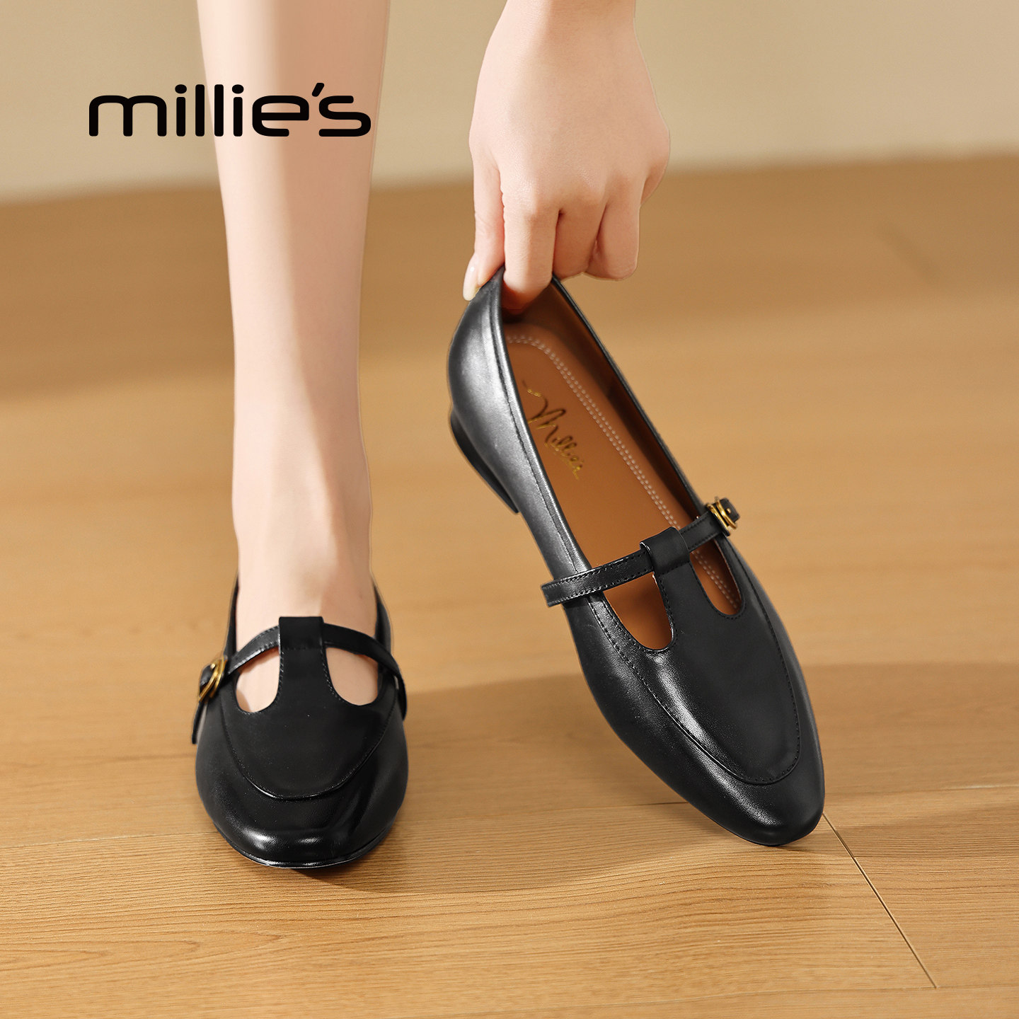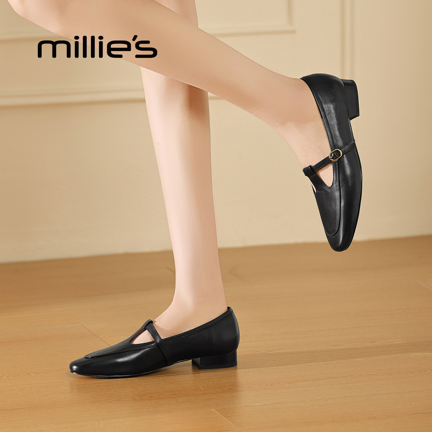 MILLIE'S/妙丽法式复古风玛丽珍鞋女黑色浅口单鞋通勤百搭小皮鞋Q