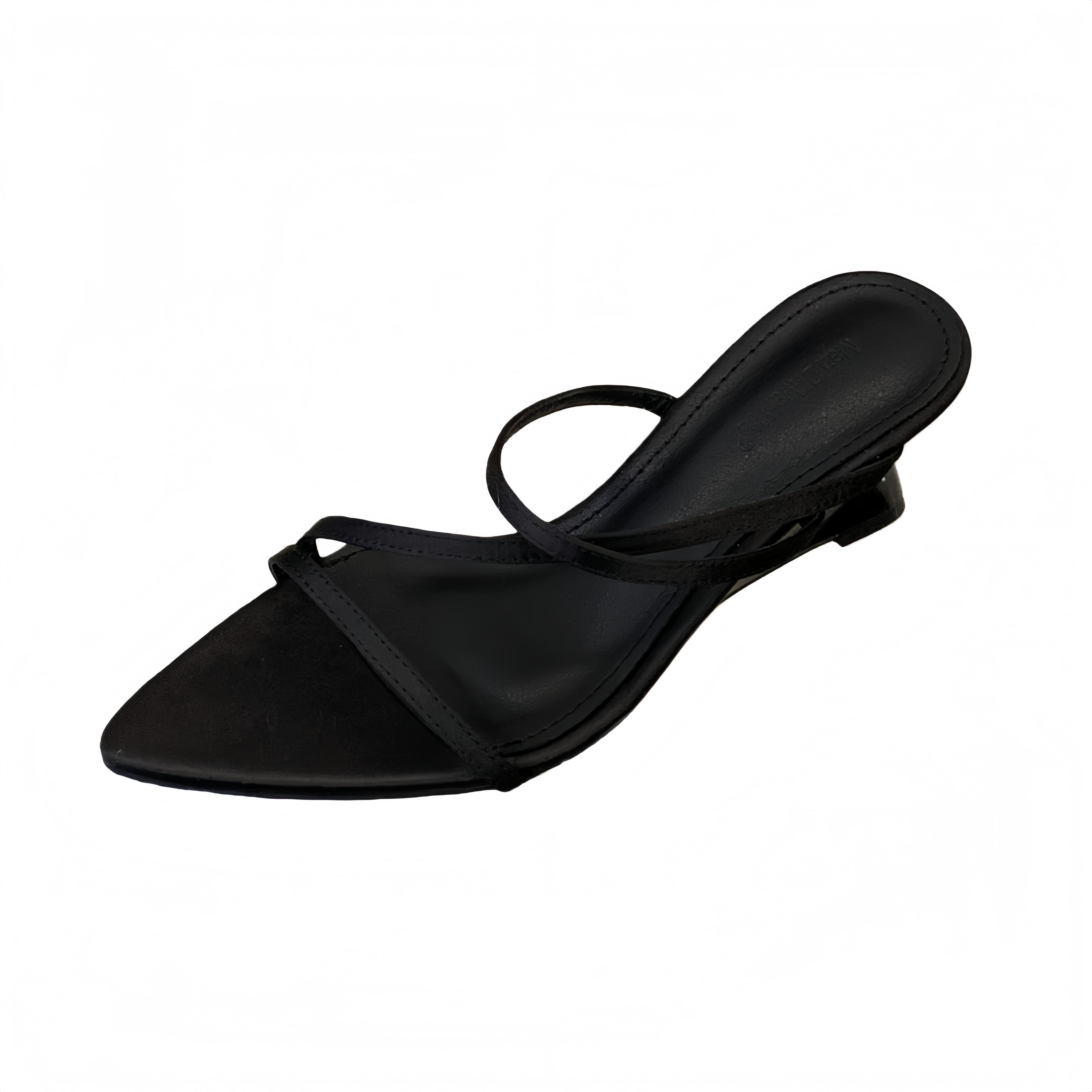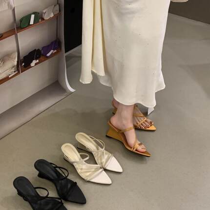 2026夏季新款尖头绸缎面坡跟中跟拖鞋高跟外穿女凉拖细带一字拖