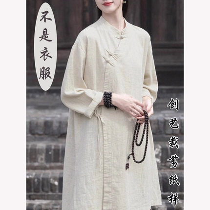 缝制衣服的E380中式文艺系带亚麻衬衫女长款禅意茶服棉麻上衣纸样
