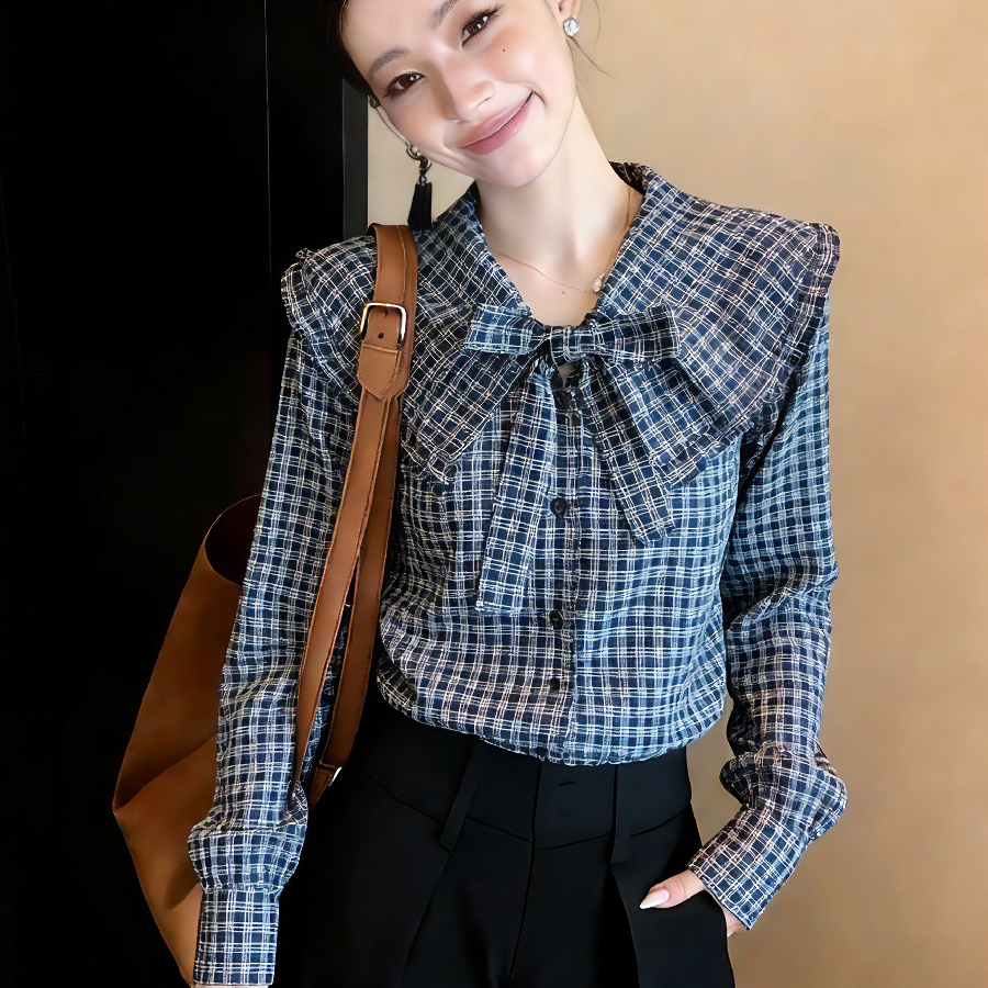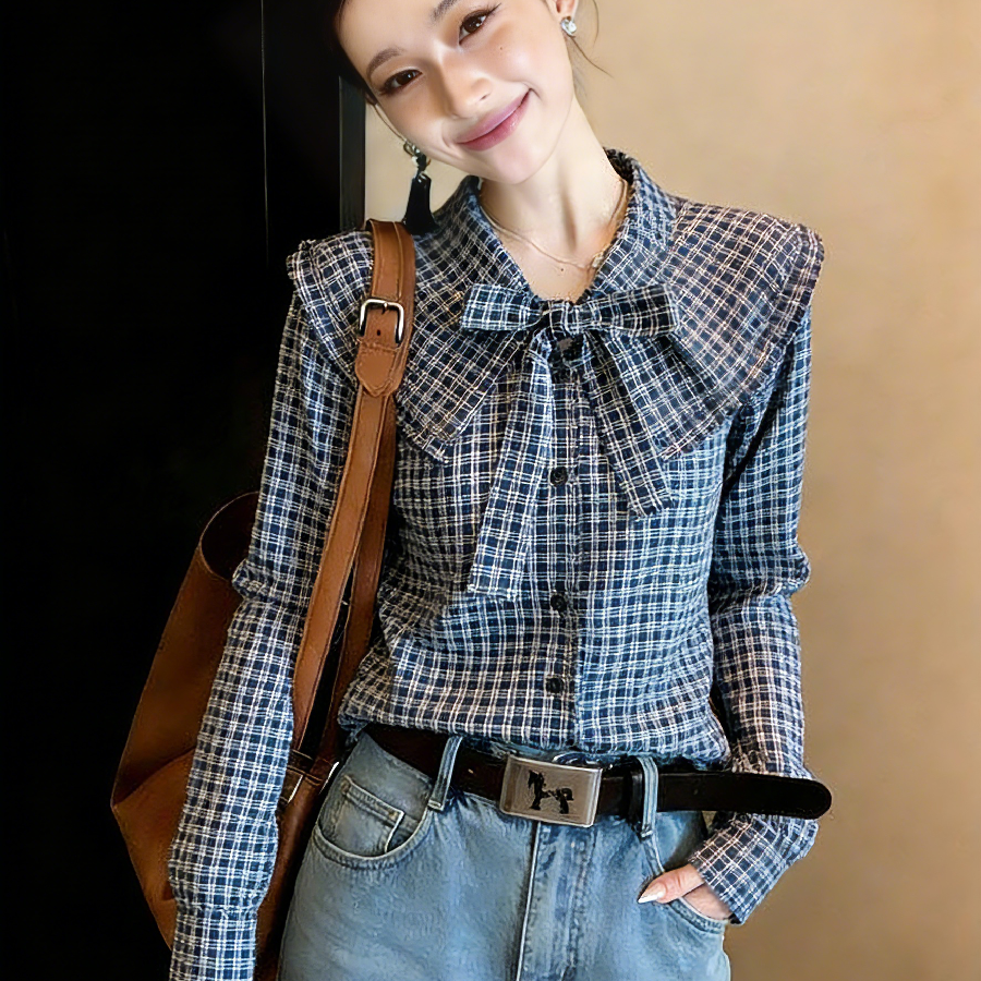 2026春季新款法式长袖上衣女设计感小众娃娃领蝴蝶结格子衬衫