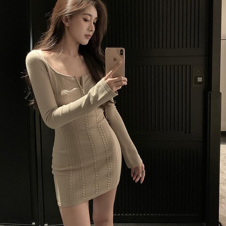 秋冬季新款针织拉链连衣裙修身显瘦气质辣妹性感包臀短裙配大衣女