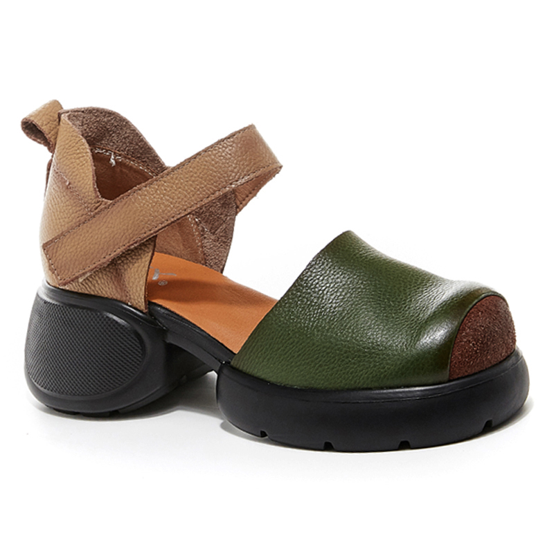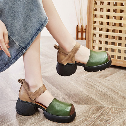 粗跟方头拼色休闲包头包跟女士凉鞋2025新款夏季真皮高跟罗马鞋子