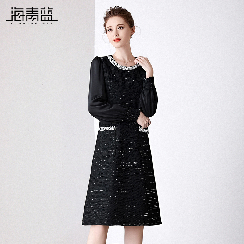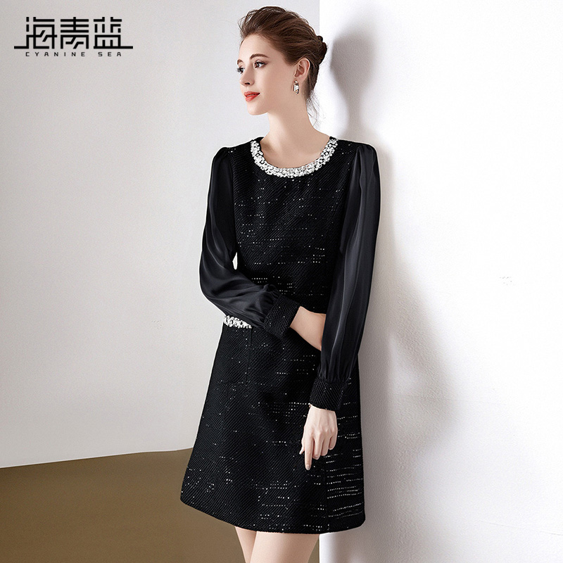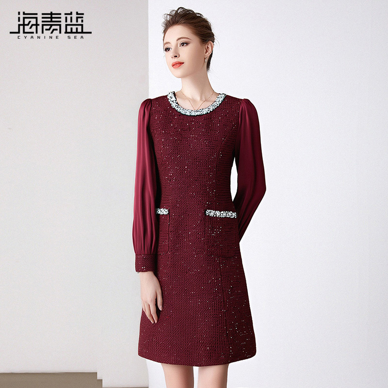 海青蓝 连衣裙2025新款红色长袖拼接时尚气质高级秋冬女装裙子