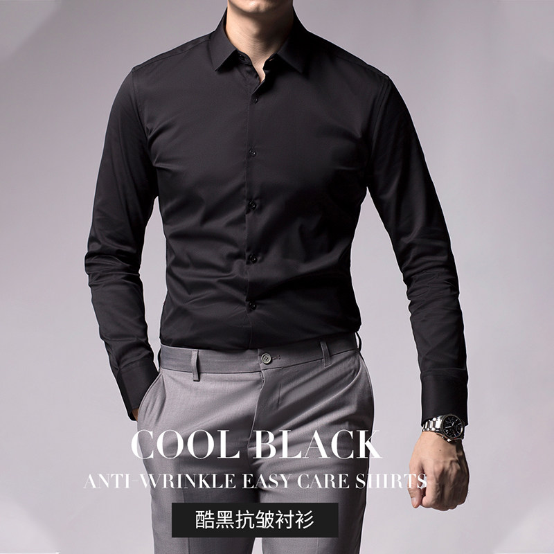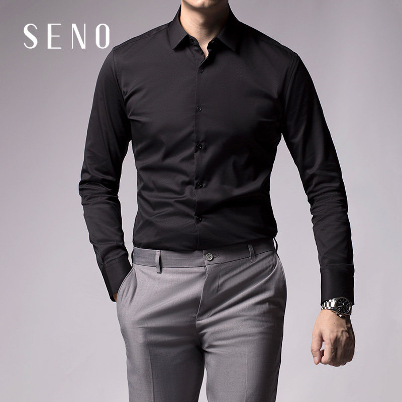 seno商务黑色衬衫男长袖修身免烫上班潮流韩版秋冬商务正装黑衬衣