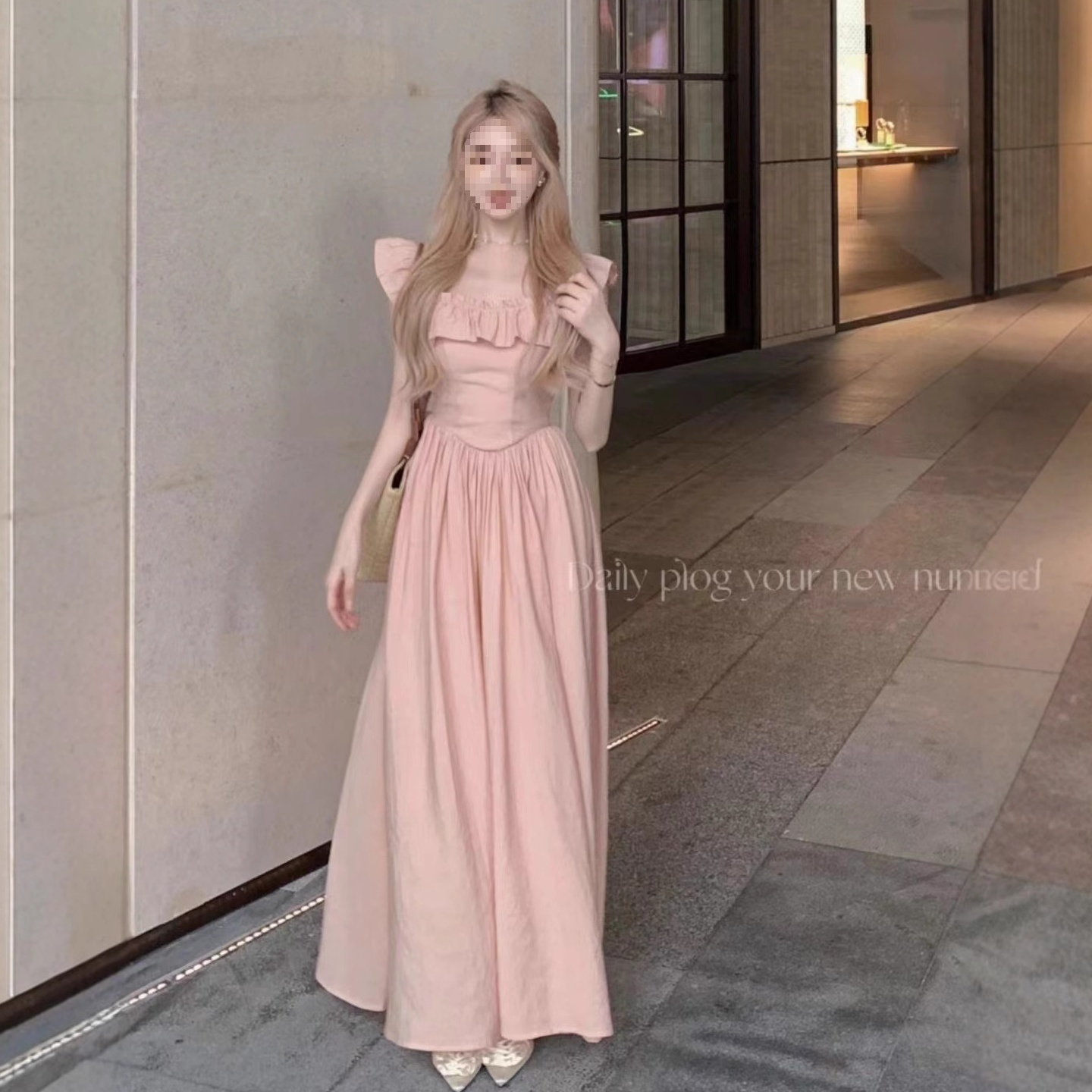 夏季新款时尚蜜桃奶冻超仙法式荷叶边方领连衣裙收腰显瘦长裙