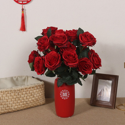 亲迎结婚喜庆婚房布置装饰 18头10头红色仿真玫瑰花束 摆件花假花