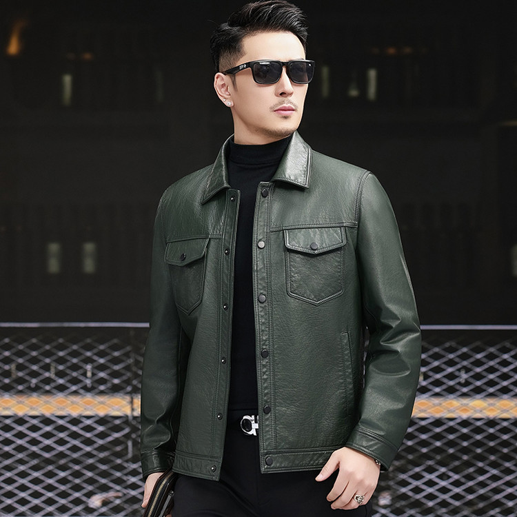 海宁真皮皮衣男士时尚牛仔翻领头层小黄牛皮休闲机车软皮夹克外套
