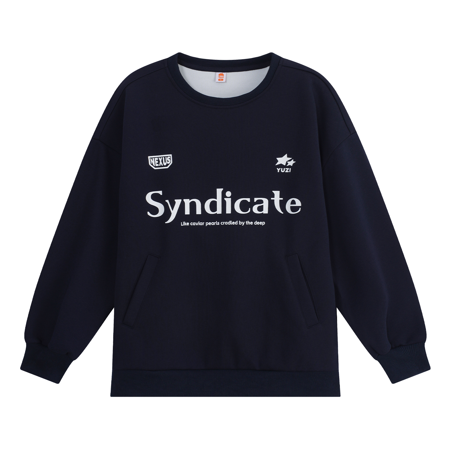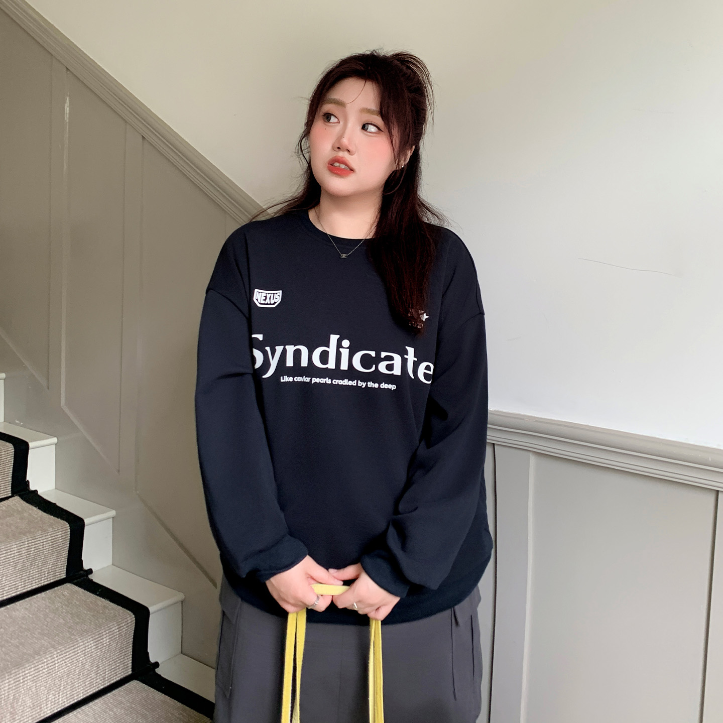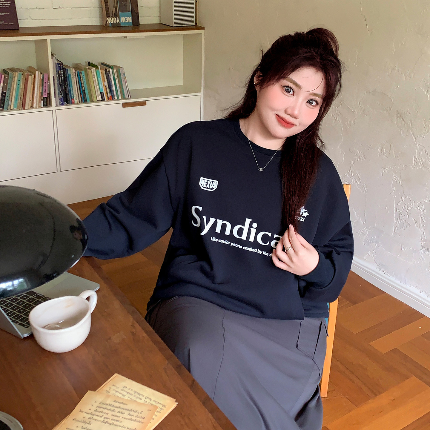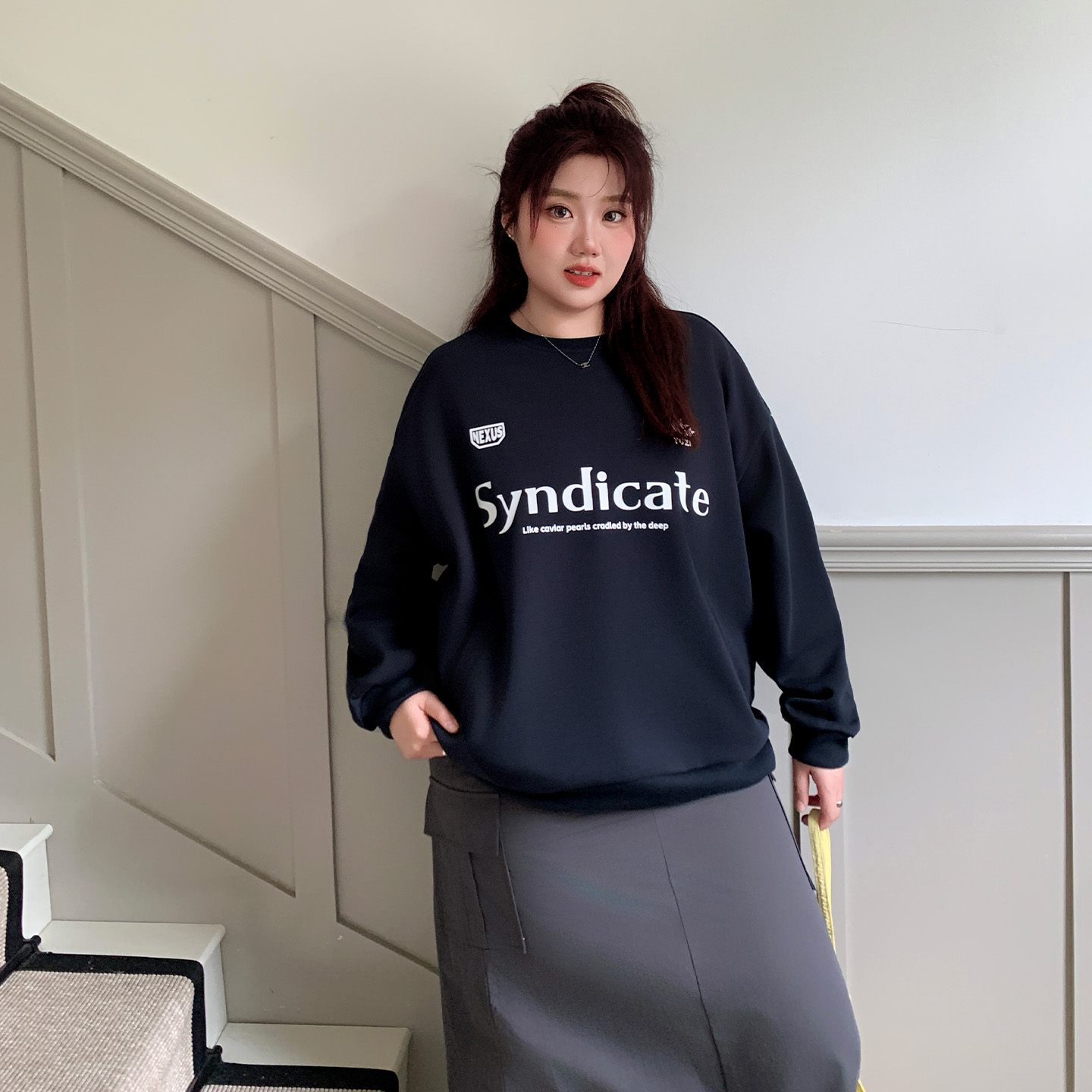 YUZI鱼子圆领卫衣特大码女装胖mm藏蓝色落肩宽松字母印花甜酷秋冬