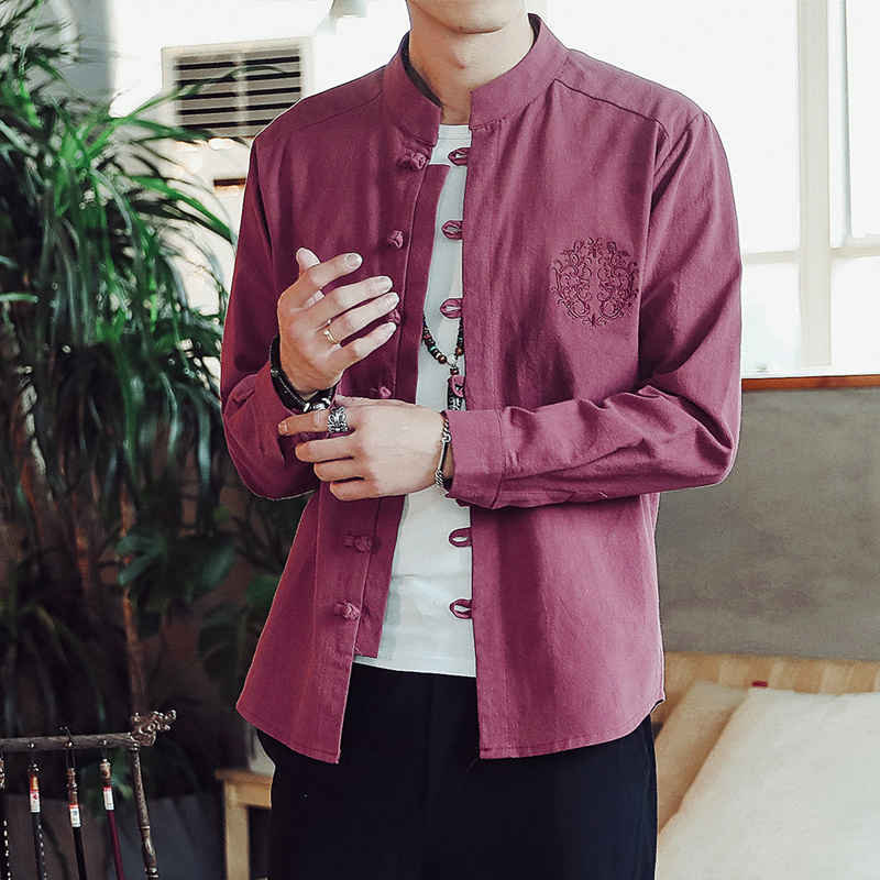 中国风秋季男士长袖衬衫中式盘扣立领刺绣唐装上衣复古汉服男衬衣