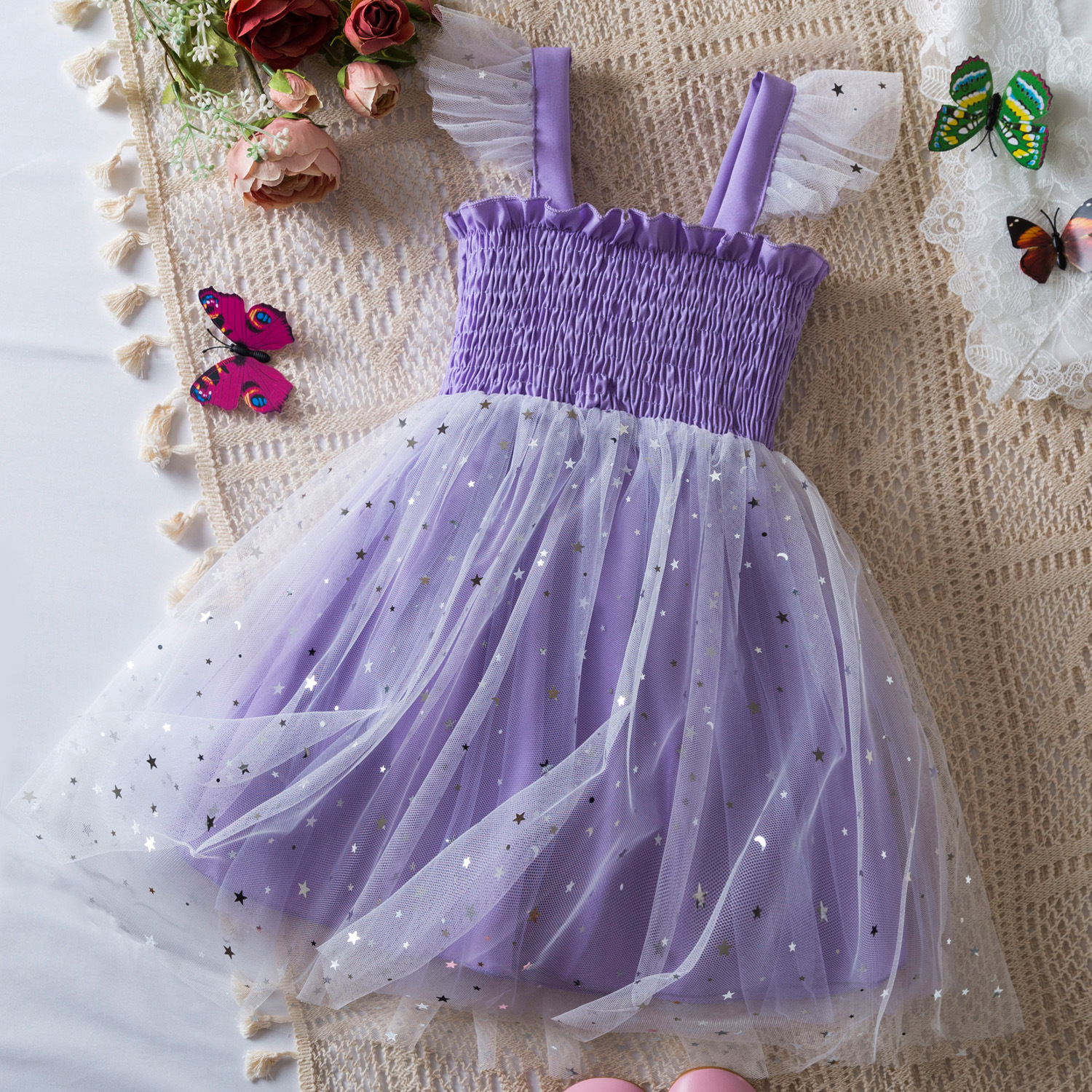 夏季新款女童连衣裙韩版星星亮片网纱公主裙可爱飞飞袖吊带裙
