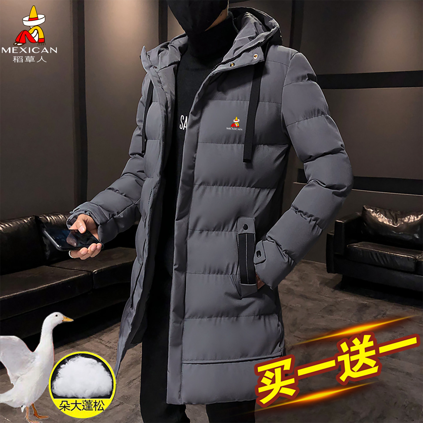 稻草人男士中长款羽绒服冬季新款潮流加厚棉衣棉袄冬装连帽外套男
