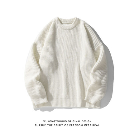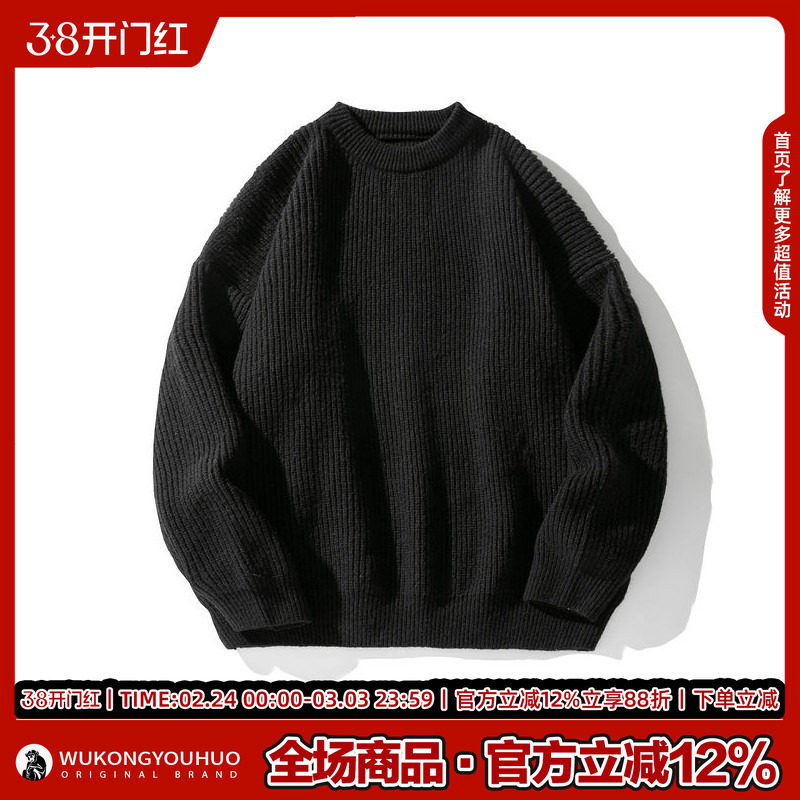 悟空有货复古日系纯色百搭圆领毛衣打底衫男秋季宽松百搭针织上衣