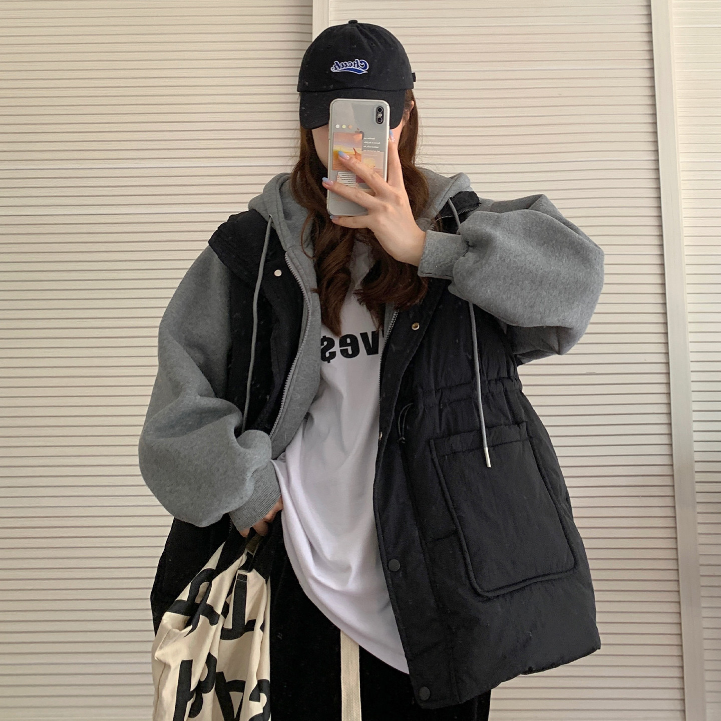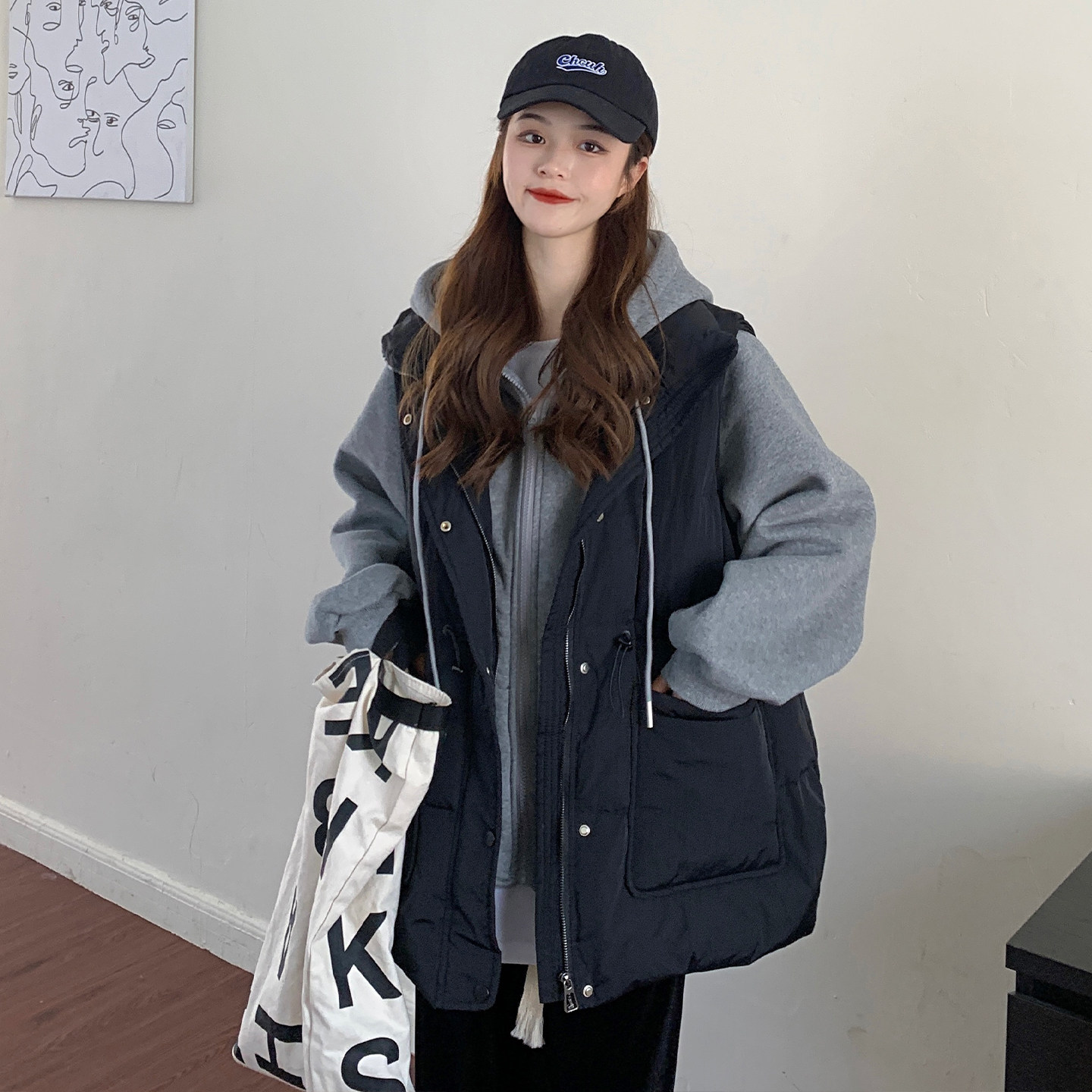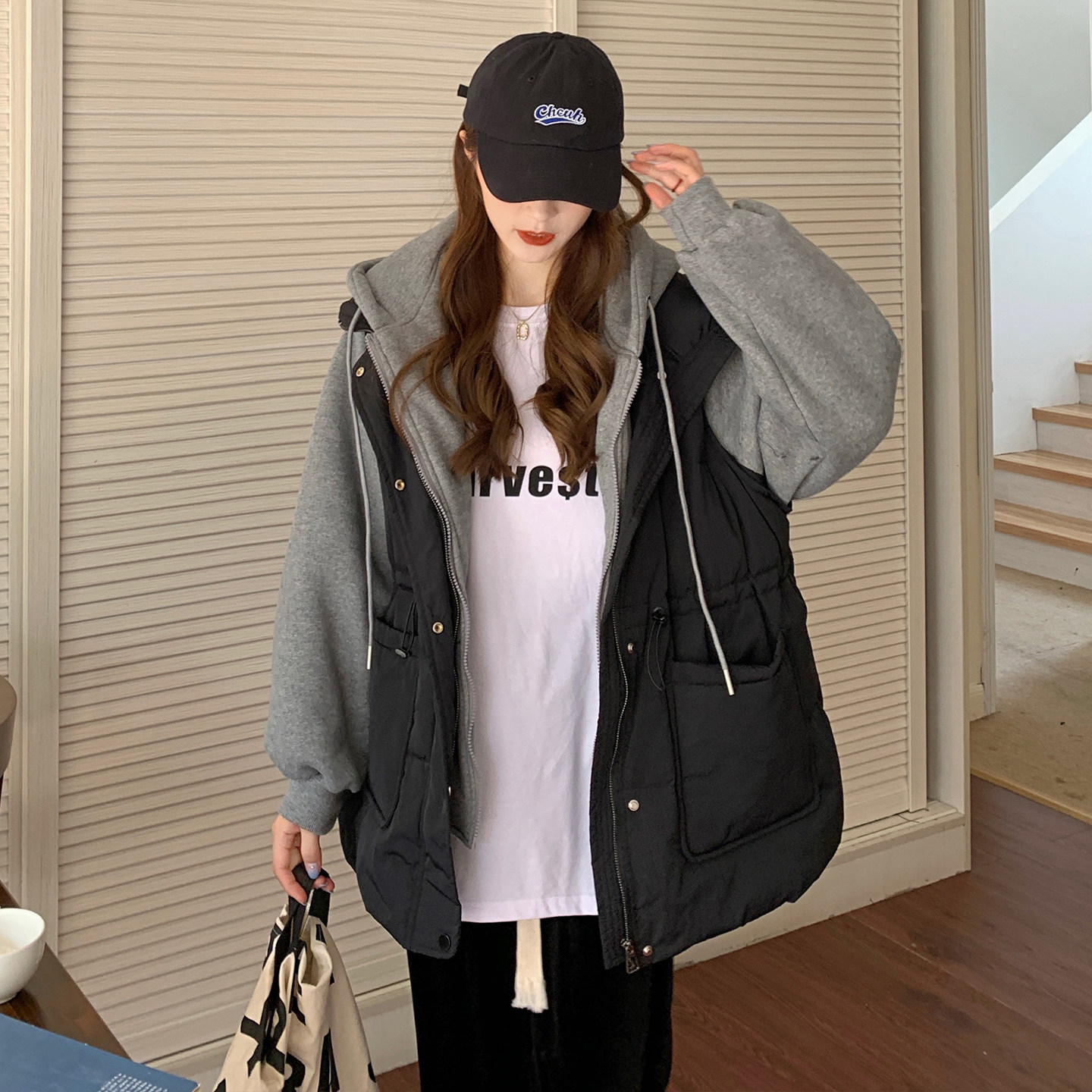300斤特大码黑色遮肉显瘦假两件棉服女秋冬胖mm加厚保暖连帽外套