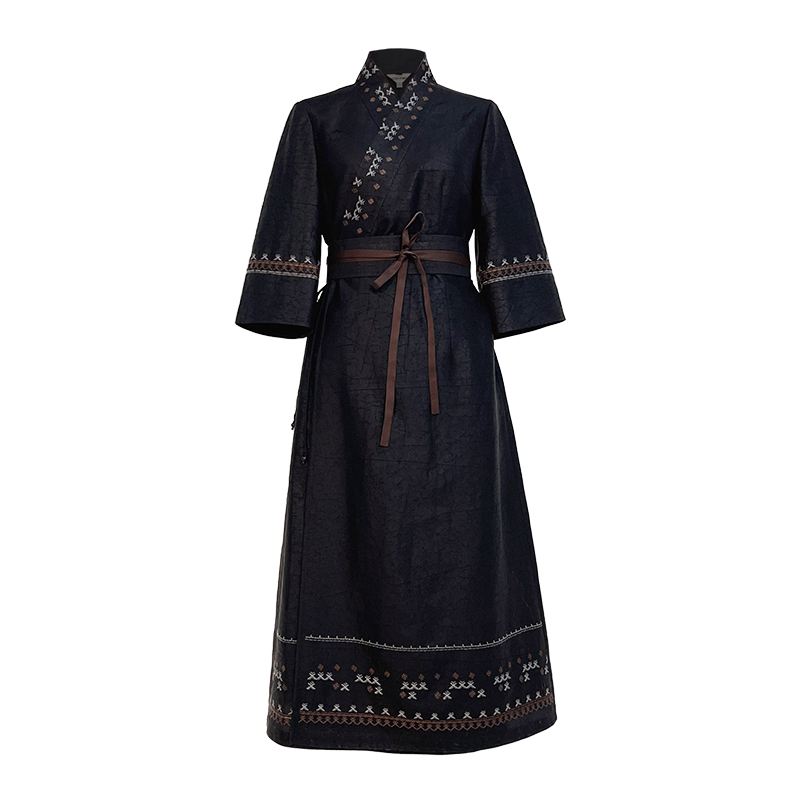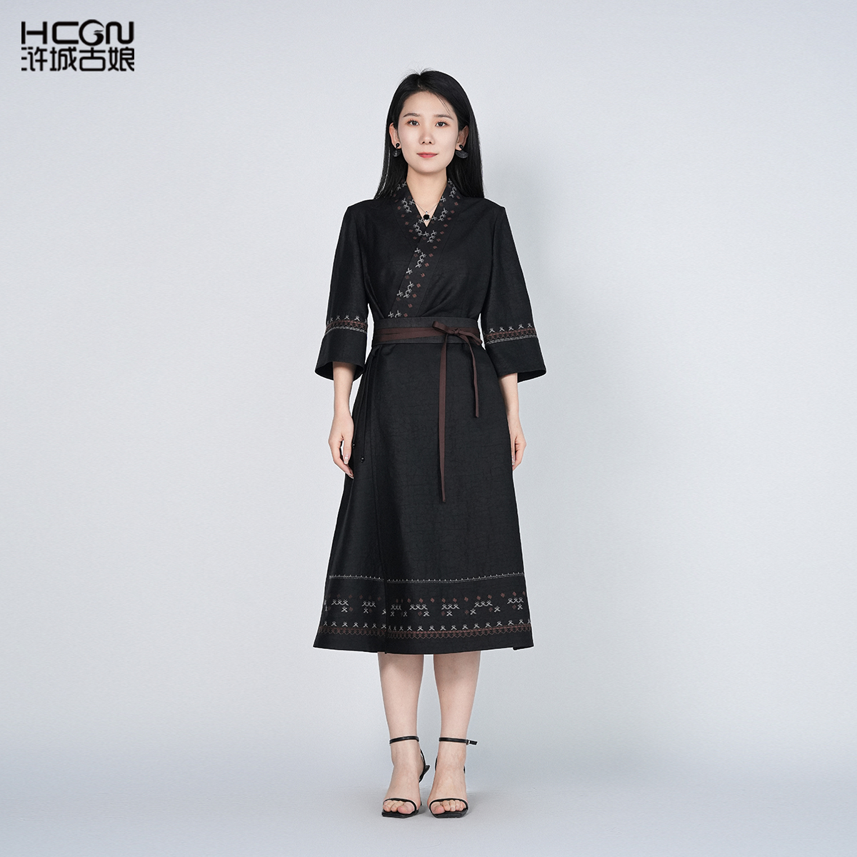 浒城古娘夏季新款香云纱V领气质高级黑色桑蚕丝新中式连衣裙女
