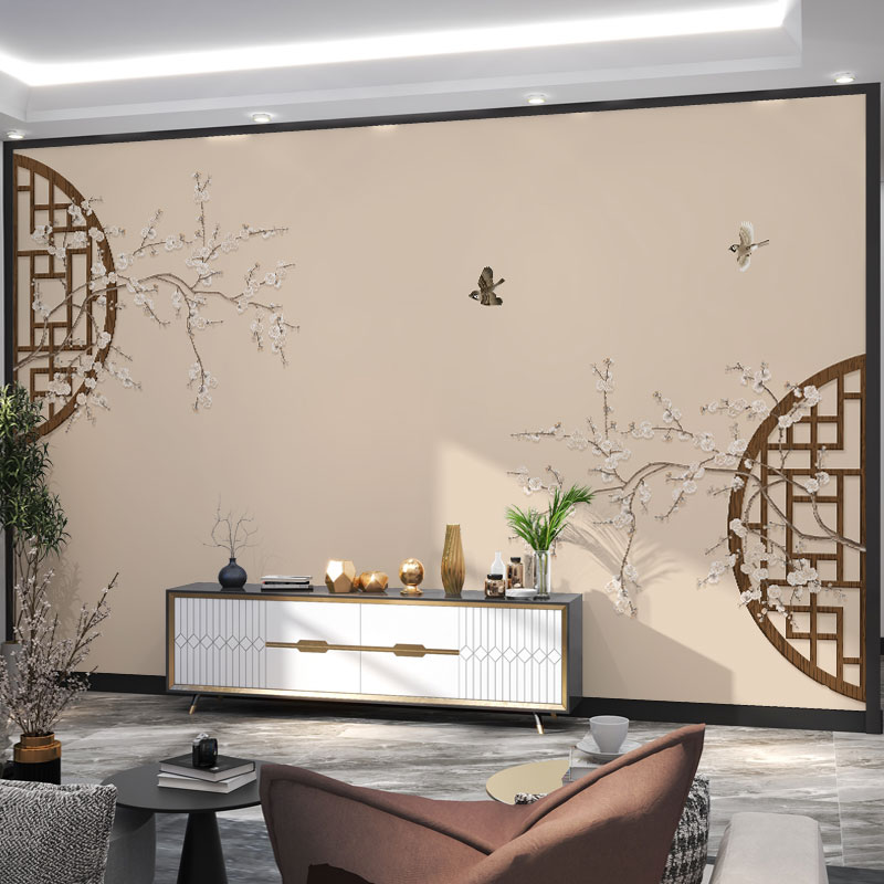 热销墙纸定制3d立体中式格栅花鸟电视背景墙壁纸客厅壁布卧室墙布